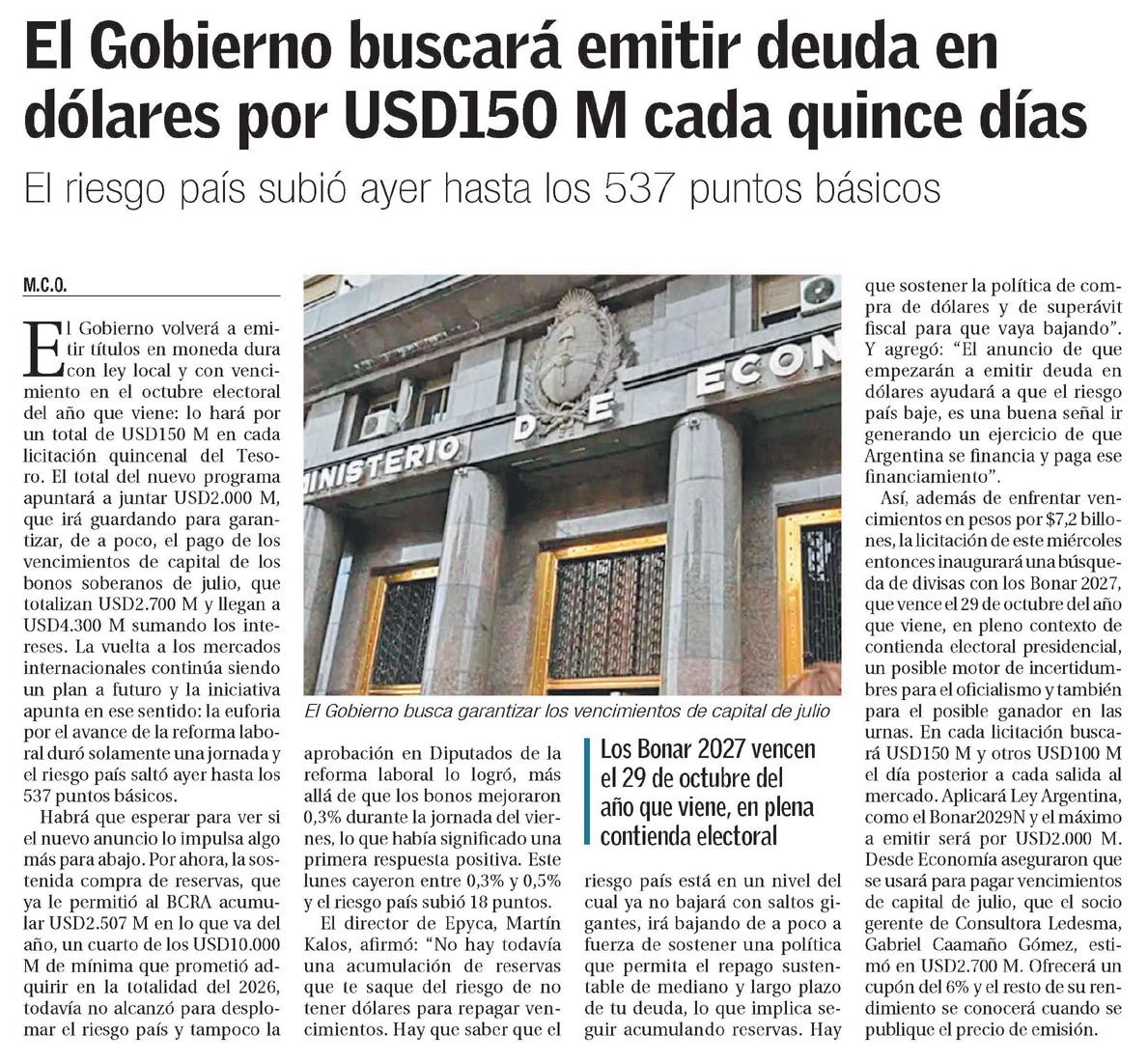 BAE – El Gobierno buscará emitir deuda en dólares por USD150 M cada quince días