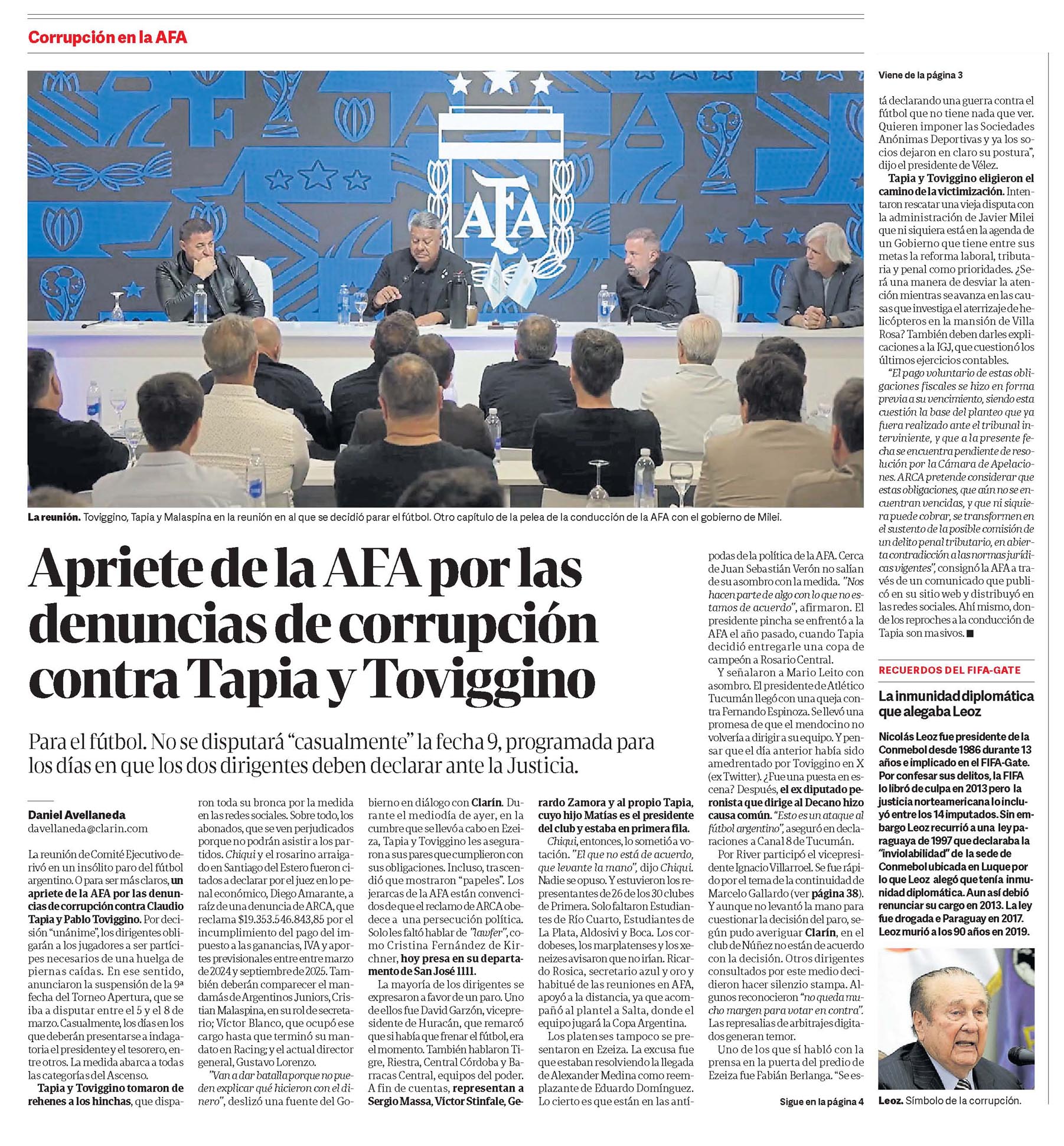 CLARÍN – Apriete de la AFA por las denuncias de corrupción contra Tapia y Toviggino