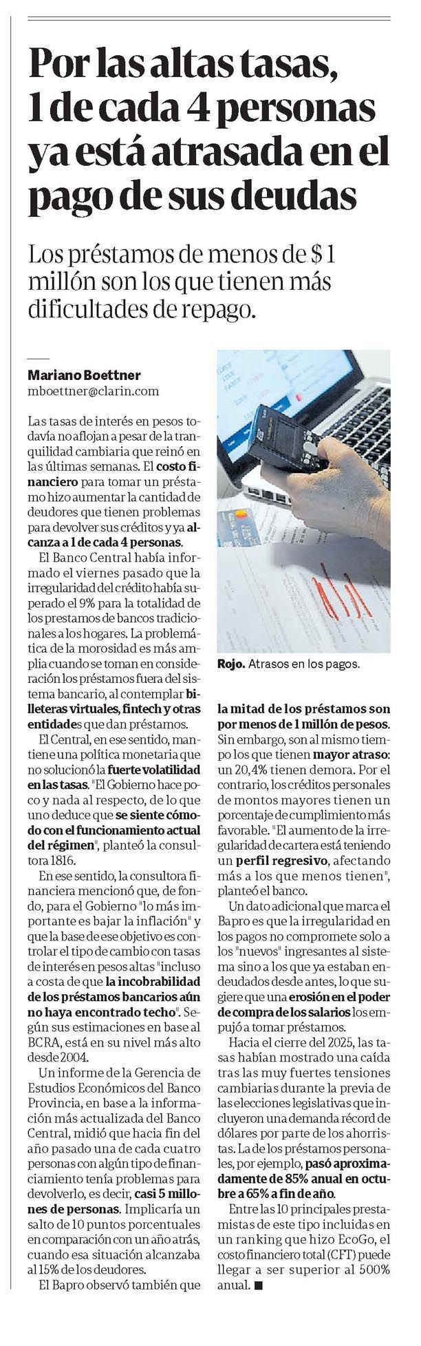 CLARÍN – Por las altas tasas, 1 de cada 4 personas ya está atrasada en el pago de sus deudas