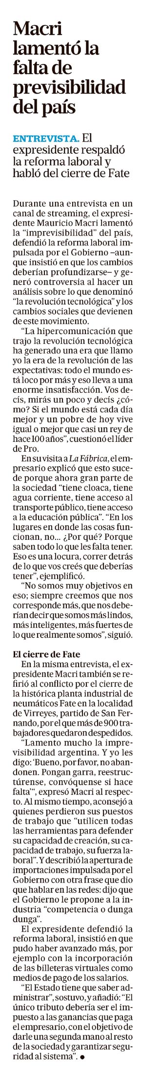El expresidente respaldó la reforma laboral y habló del cierre de Fate. Durante una entrevista en un canal de streaming, el expresidente Mauricio Macri lamentó la “imprevisibilidad” del país, defendió la reforma laboral impulsada por el Gobierno –aunque insistió en que los cambios deberían profundizarse– y generó controversia al hacer un análisis sobre lo que denominó “la revolución tecnológica” y los cambios sociales que devienen de este movimiento.
