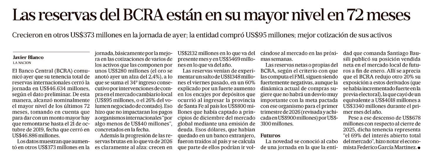 LA NACIÓN – Las reservas del BCRA están en su mayor nivel en 72 meses