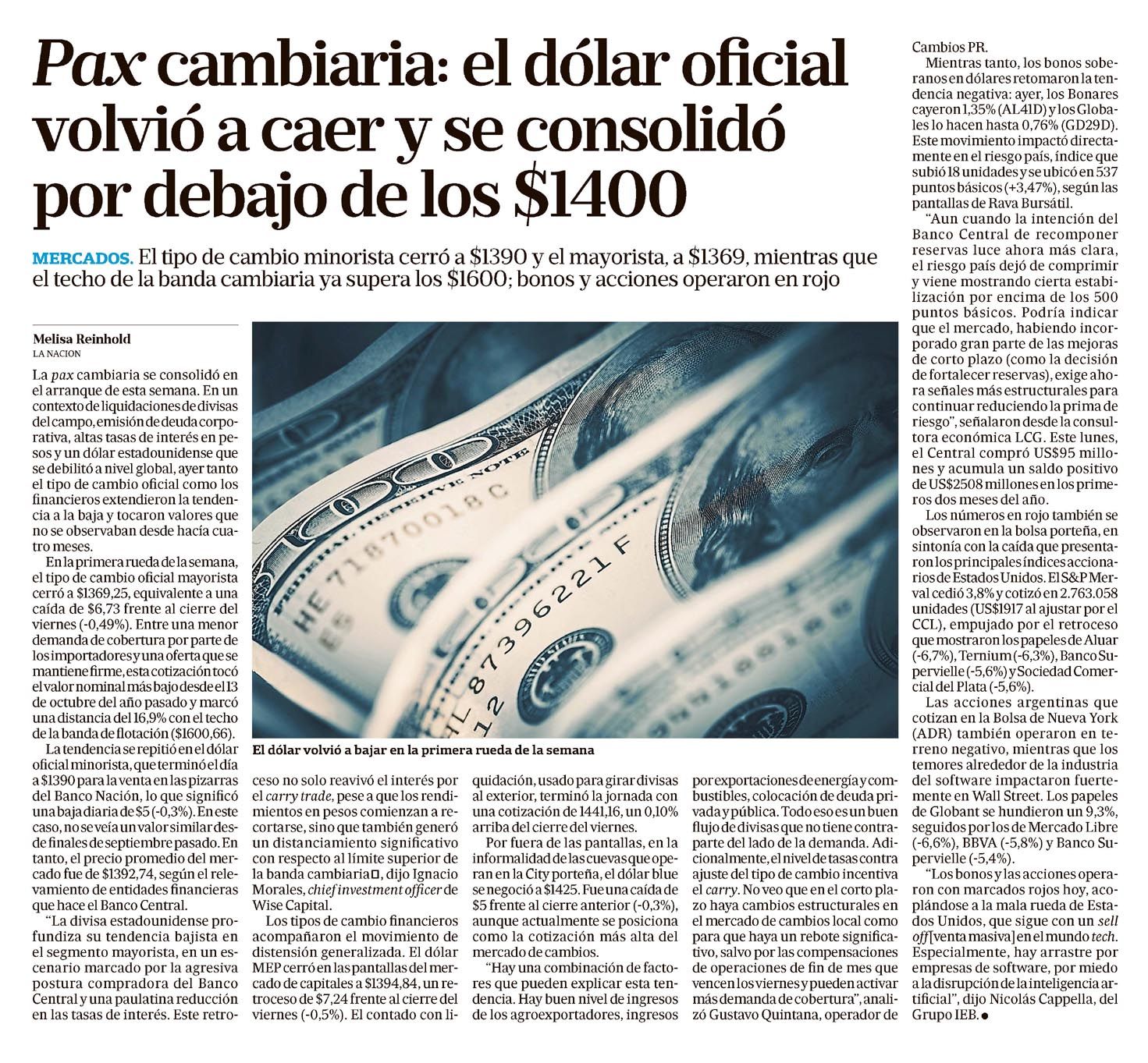 LA NACIÓN – Pax cambiaria: el dólar oficial volvió a caer y se consolidó por debajo de los $1400