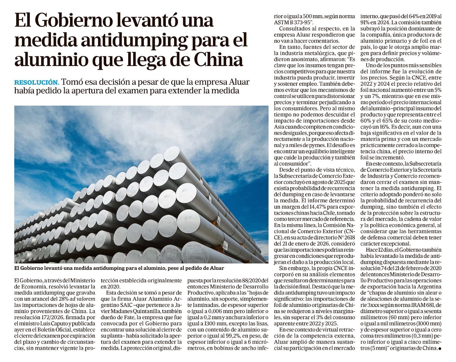 LA NACIÓN – El Gobierno levantó una medida antidumping para el aluminio que llega de China