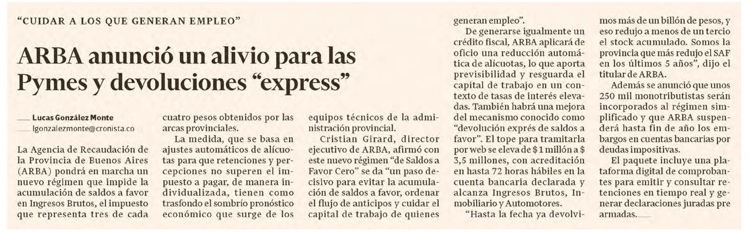 EL CRONISTA – ARBA anunció un alivio para las Pymes y devoluciones "express"