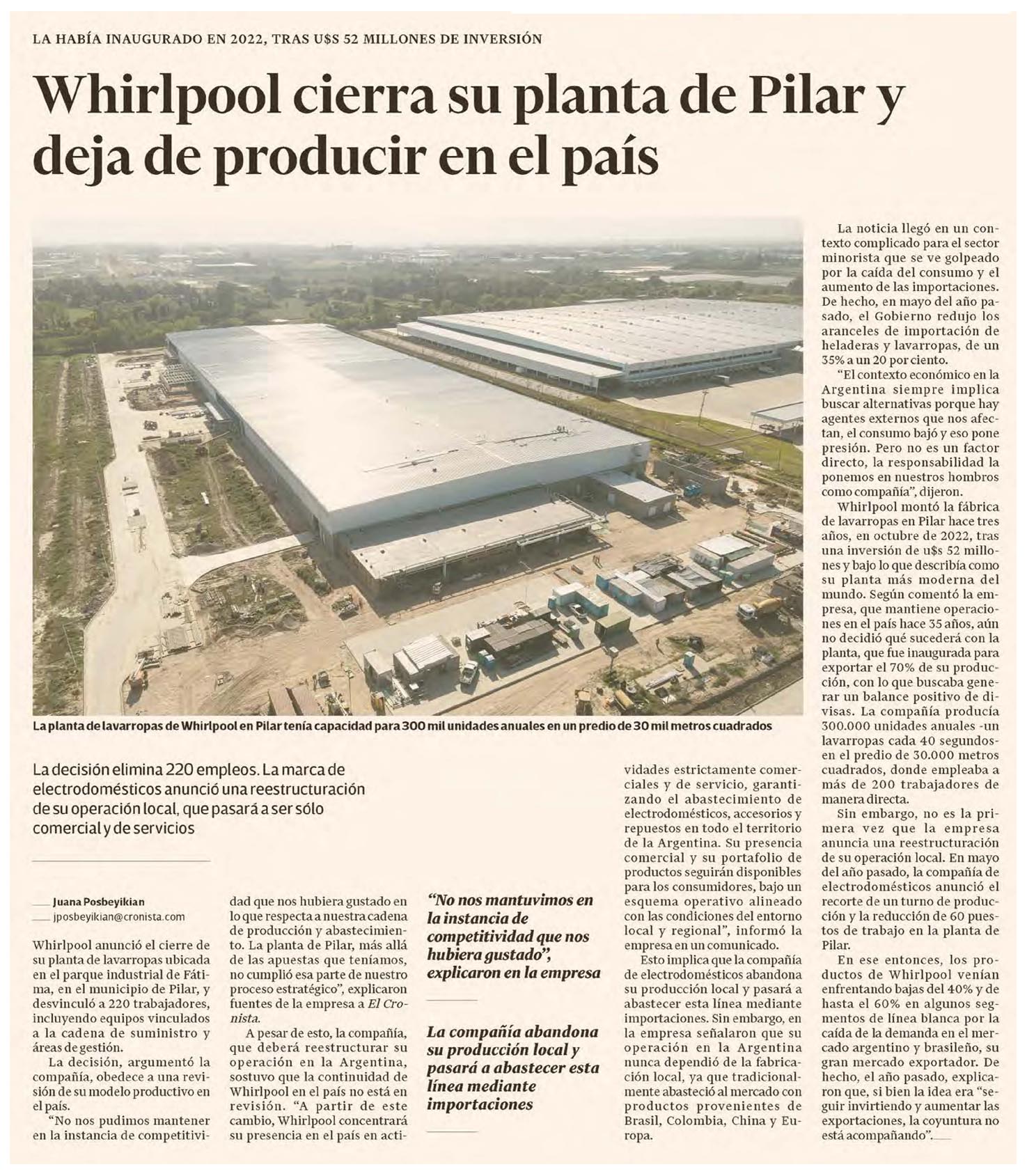 EL CRONISTA – Whirlpool cierra su planta de Pilar y deja de producir en el país