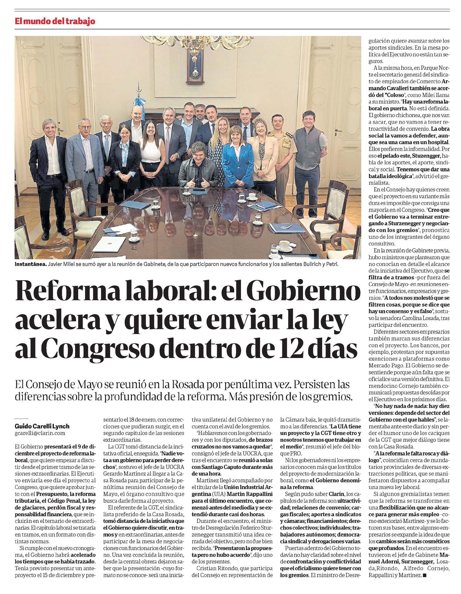 CLARÍN – Reforma laboral: el Gobierno acelera y quiere enviar la ley al Congreso dentro de 12 días