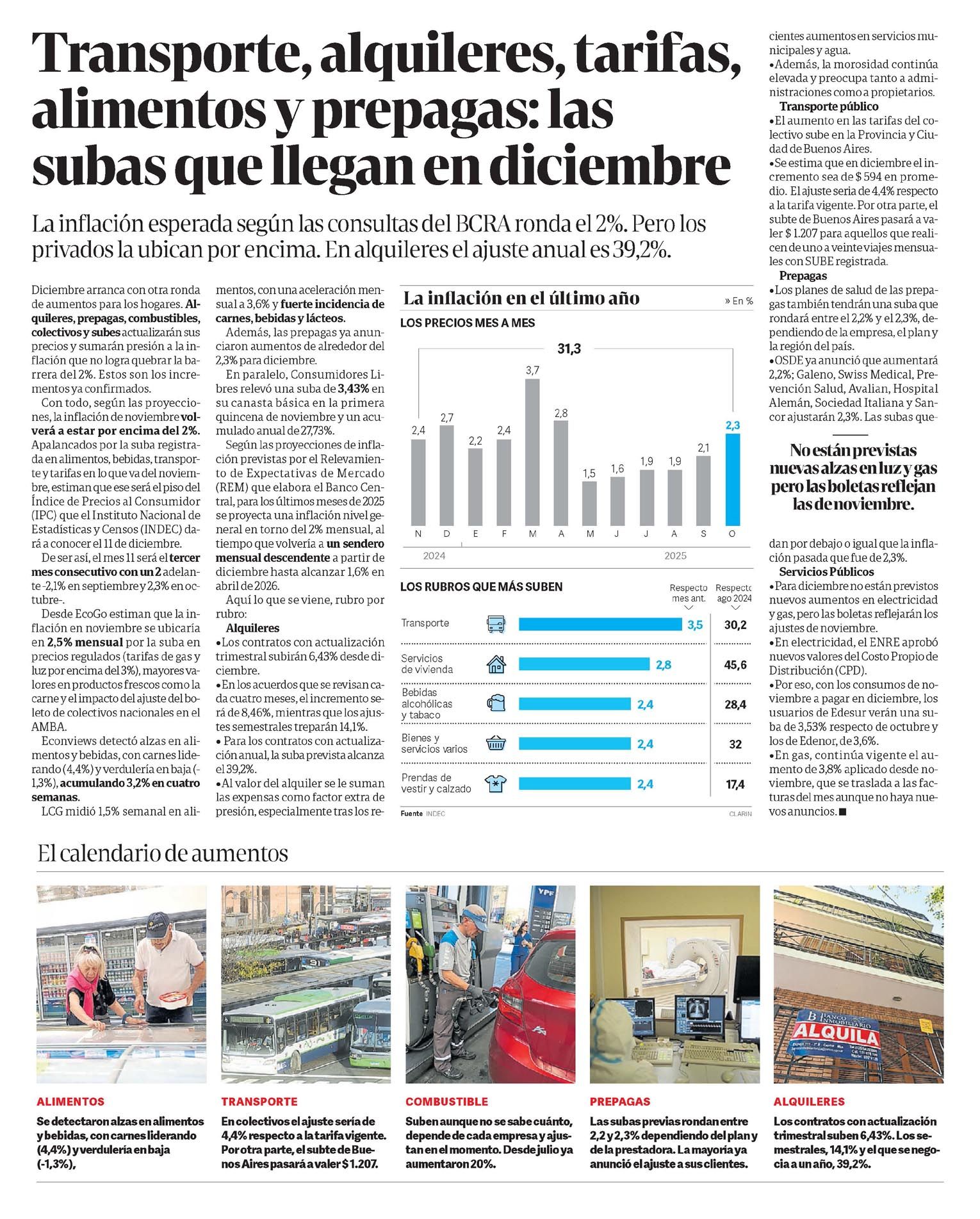 CLARÍN – Transporte, alquileres, tarifas, alimentos y prepagas: las subas que llegan en diciembre