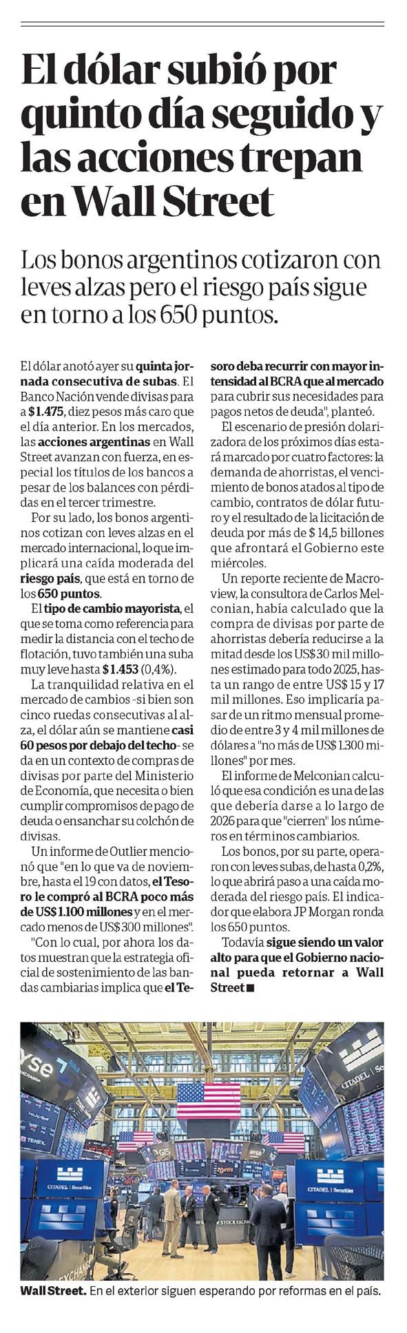 CLARÍN – El dólar subió por quinto día seguido y las acciones trepan en Wall Street