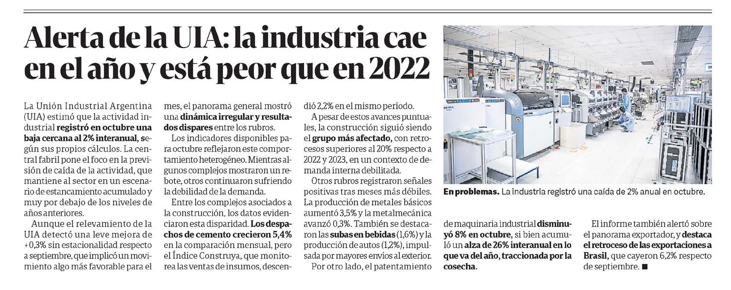 CLARÍN – Alerta de la UIA: la industria cae en el año y está peor que en 2022