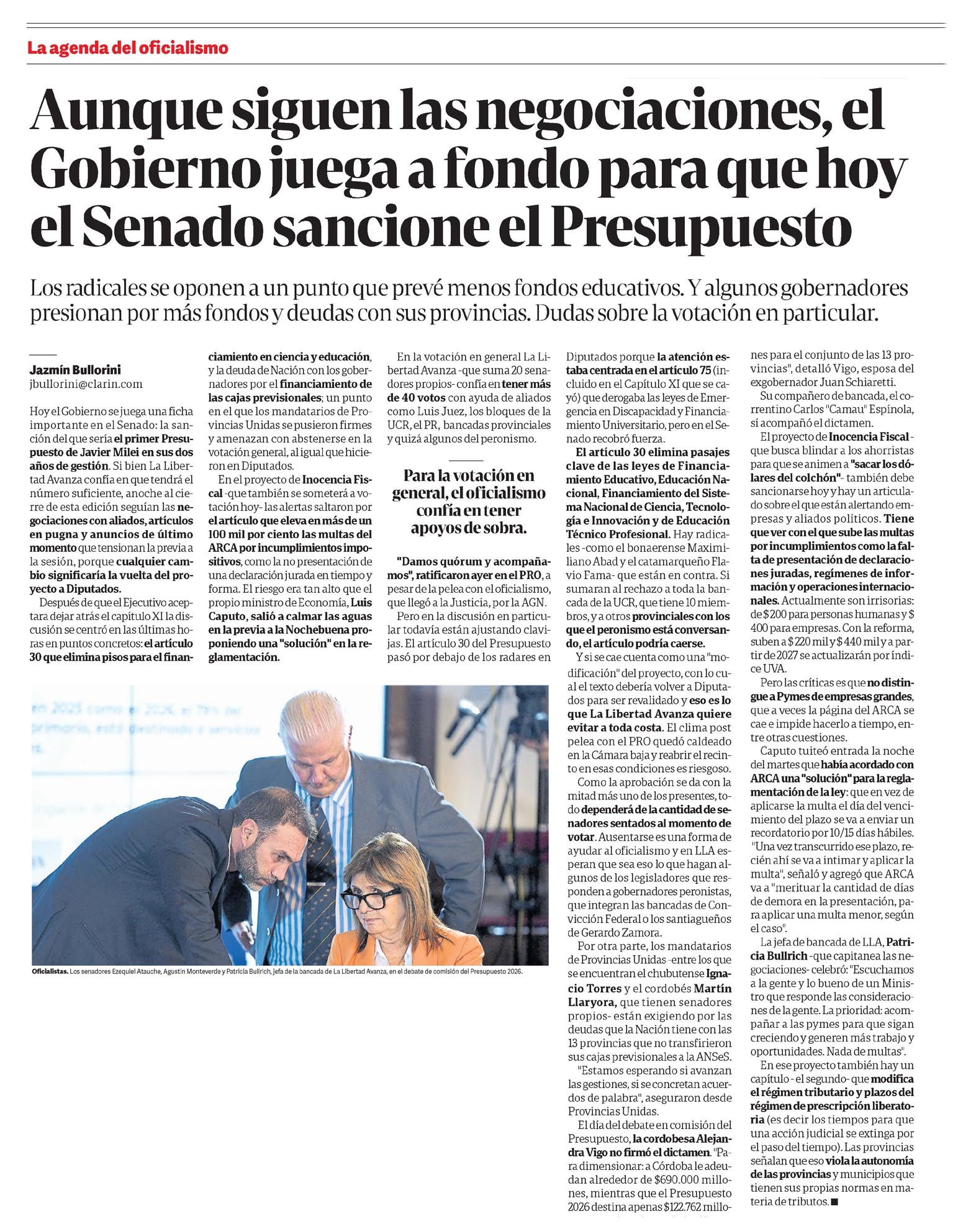 CLARÍN – Aunque siguen las negociaciones, el Gobierno juega a fondo para que hoy el Senado sancione el Presupuesto