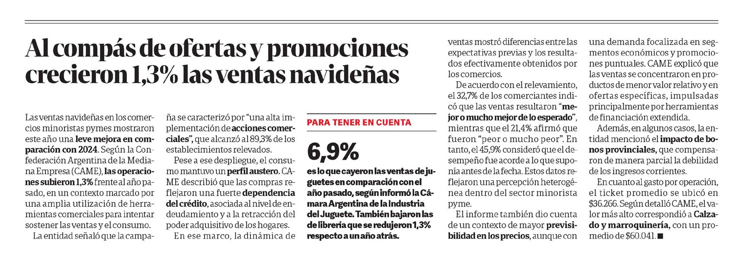 Las ventas navideñas en los comercios minoristas pymes mostraron este año una leve mejora en comparación con 2024. Según la Confederación Argentina de la Mediana Empresa (CAME), las operaciones subieron 1,3% frente al año pasado, en un contexto marcado por una amplia utilización de herramientas comerciales para intentar sostener las ventas y el consumo. La entidad señaló que la campaña se caracterizó por “una alta implementación de acciones comerciales”, que alcanzó al 89,3% de los establecimientos relevados.