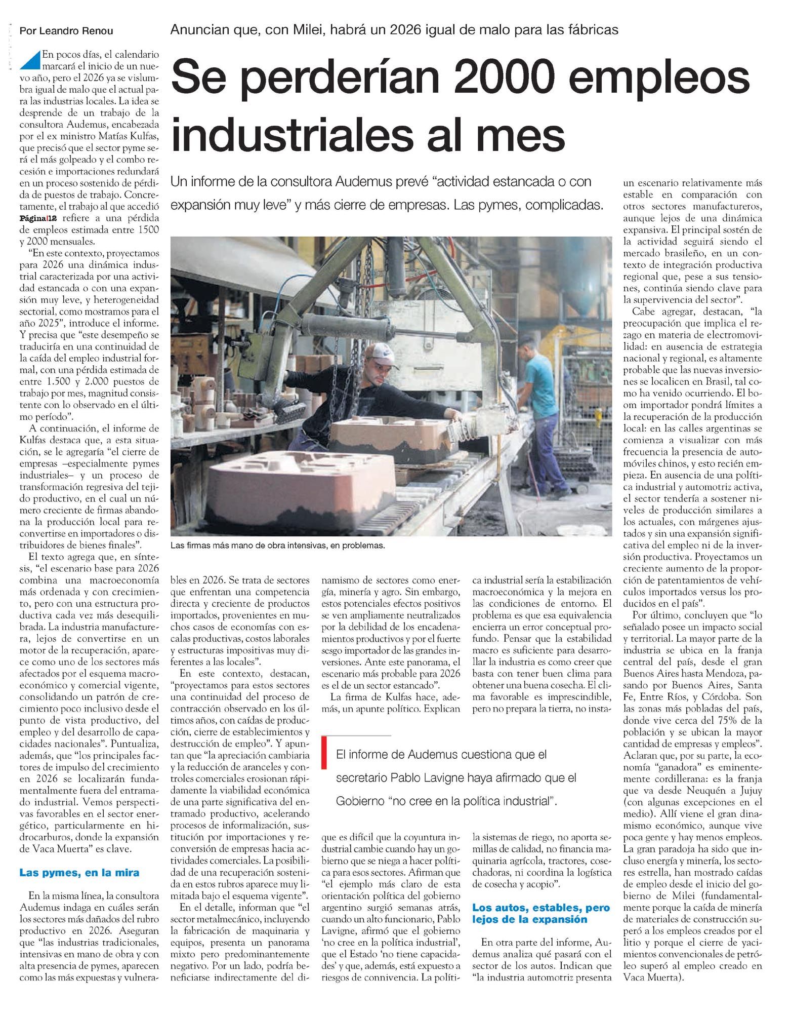En pocos días, el calendario marcará el inicio de un nuevo año, pero el 2026 ya se vislumbra igual de malo que el actual para las industrias locales. La idea se desprende de un trabajo de la consultora Audemus, encabezada por el ex ministro Matías Kulfas, que precisó que el sector pyme será el más golpeado y el combo recesión e importaciones redundará en un proceso sostenido de pérdida de puestos de trabajo.