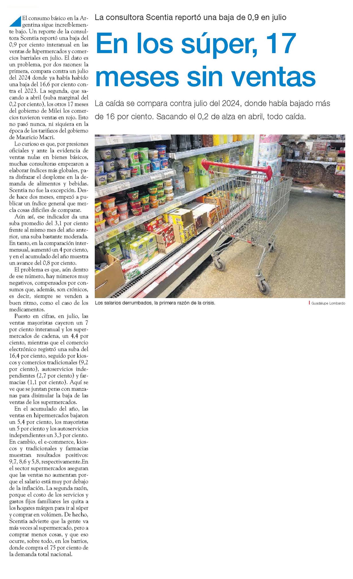 El consumo básico en la Argentina sigue increíblemente bajo. Un reporte de la consultora Scentia reportó una baja del 0,9 por ciento interanual en las ventas de hipermercados y comercios barriales en julio.