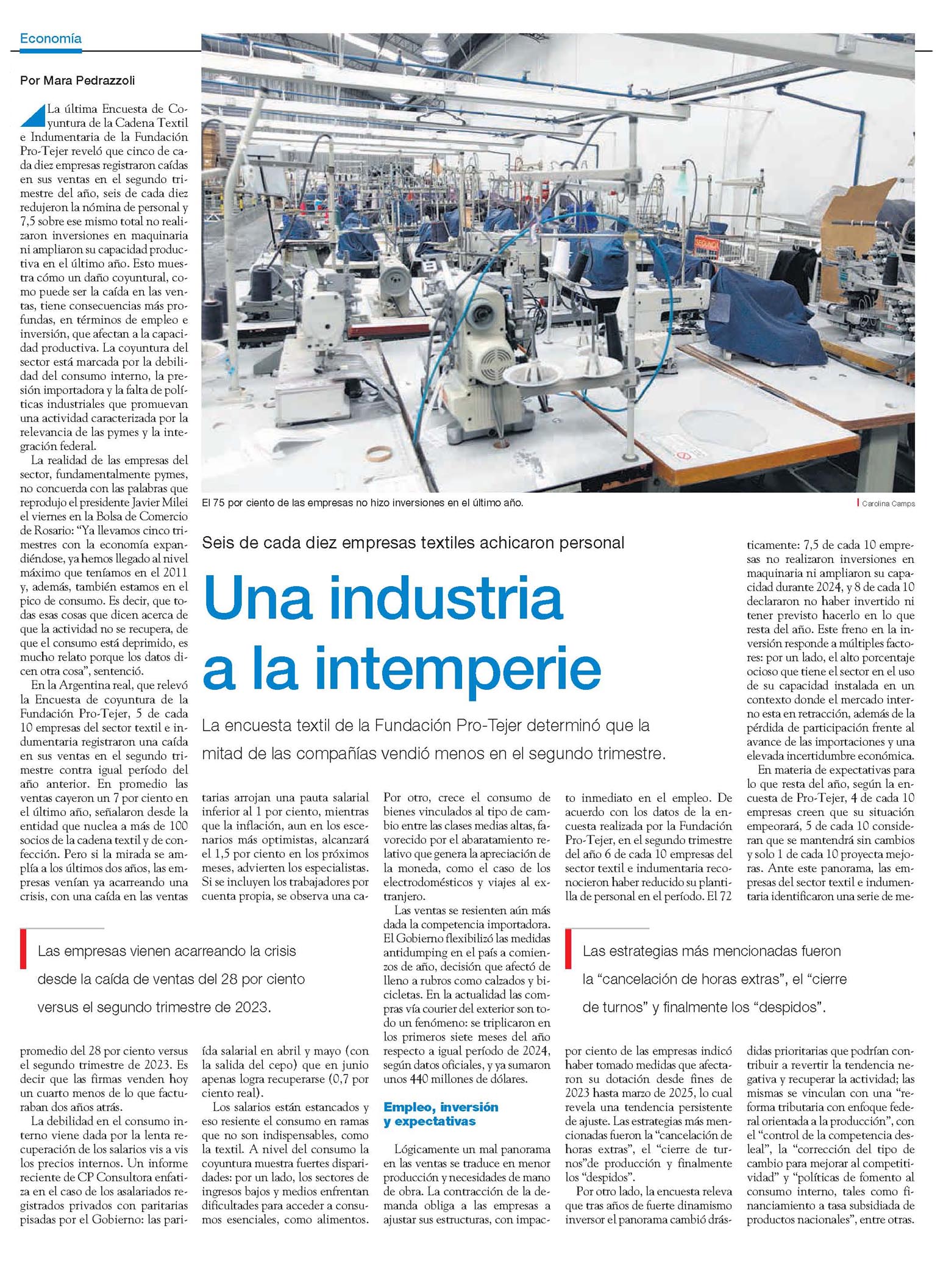 La última Encuesta de Coyuntura de la Cadena Textil e Indumentaria de la Fundación Pro-Tejer reveló que cinco de cada diez empresas registraron caída en sus ventas en el segundo trimestre del año, seis de cada diez redujeron la nómina de personal y 7,5 sobre ese mismo total no realizaron inversiones en maquinaria ni ampliaron su capacidad productiva en el último año.