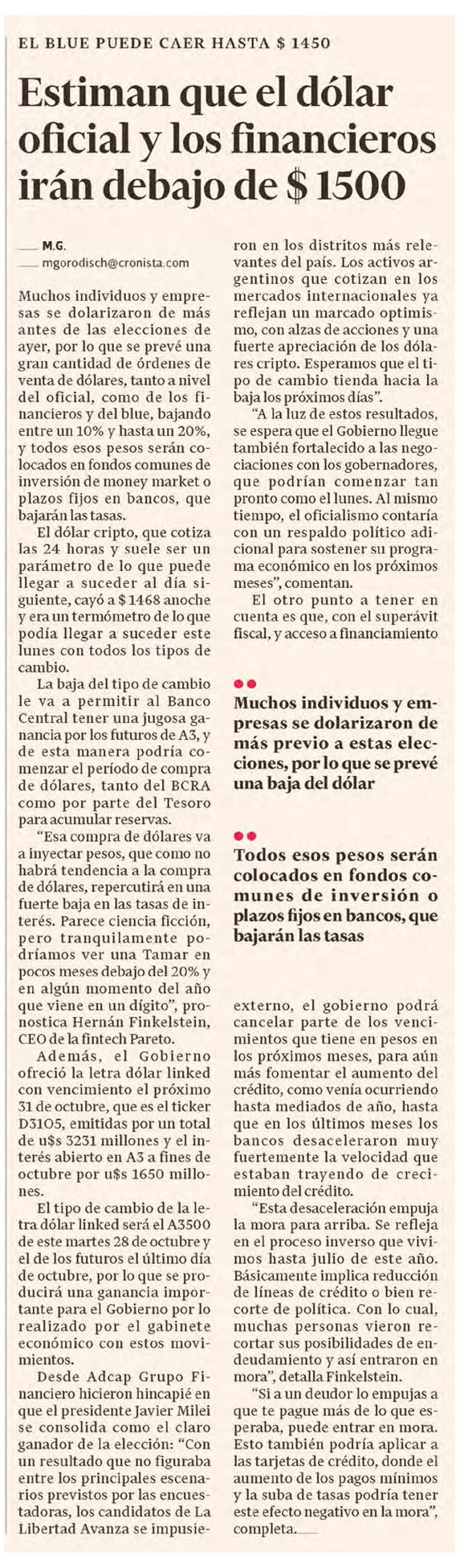 Muchos individuos y empresas se dolarizaron de más antes de las elecciones de ayer, por lo que se prevé una gran cantidad de órdenes de venta de dólares, tanto a nivel del oficial, como de los financieros y del blue, bajando entre un 10% y hasta un 20%, y todos esos pesos serán colocados en fondos comunes de inversión de money market o plazos fijos en bancos, que bajarán las tasas.