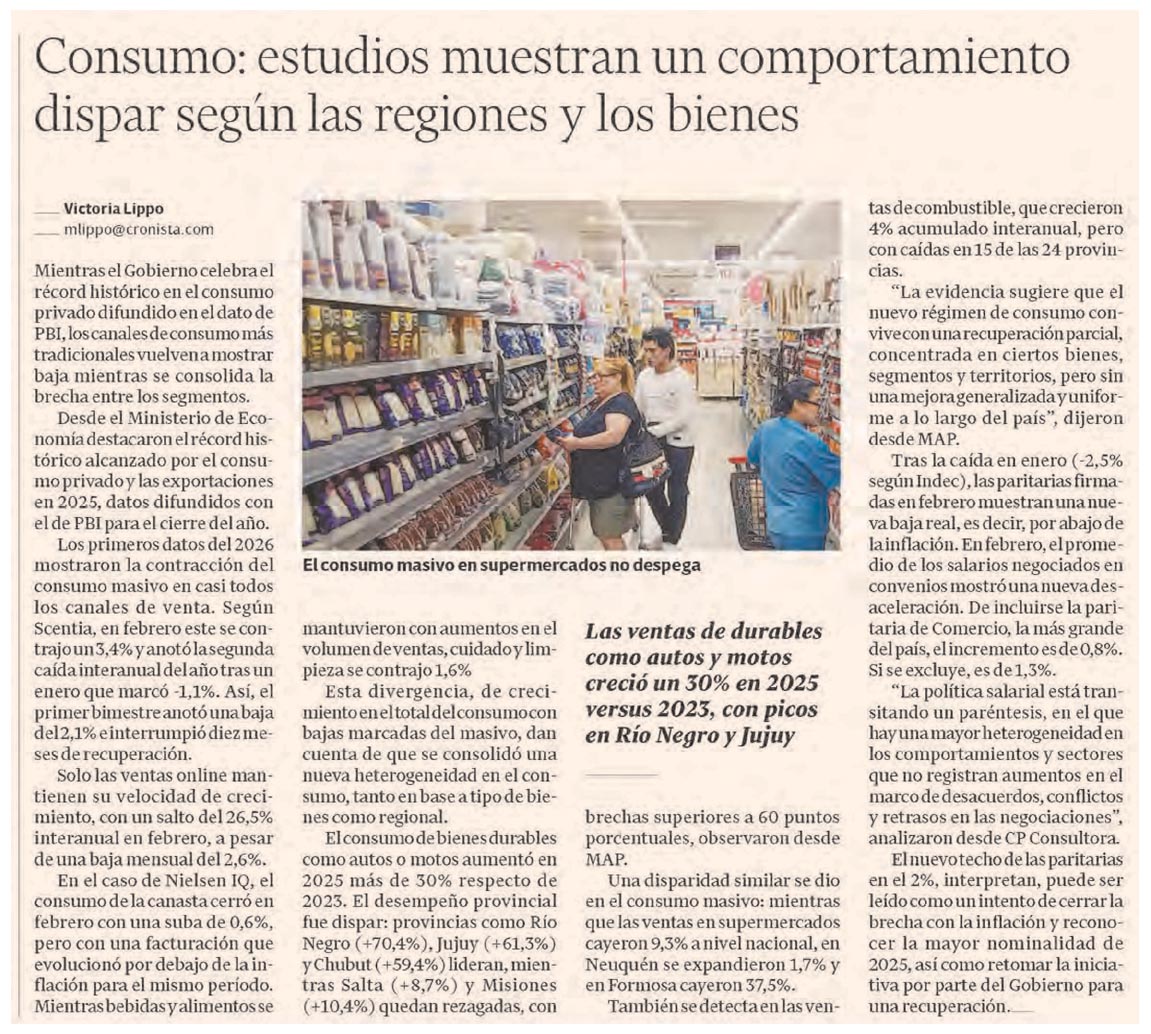 EL CRONISTA – Consumo: estudios muestran un comportamiento dispar según las regiones y los bienes