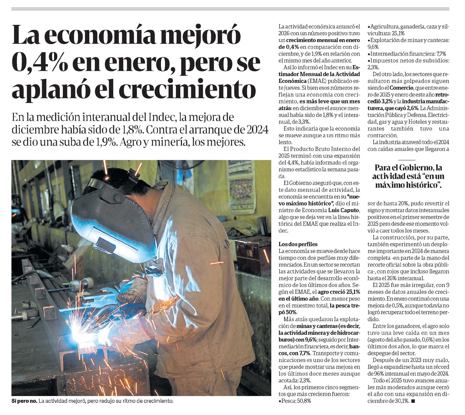 CLARÍN – La economía mejoró 0,4% en enero, pero se aplanó el crecimiento
