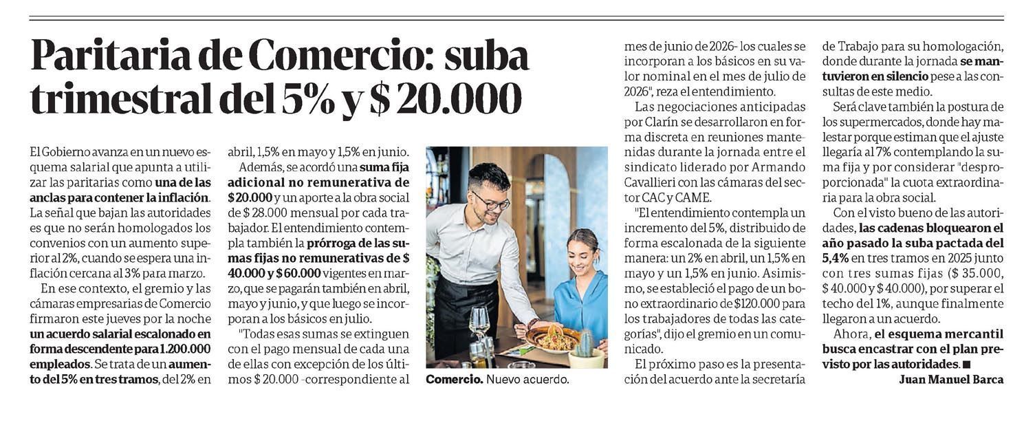 CLARÍN – Paritaria de Comercio: suba trimestral del 5% y suma fija de $20.000