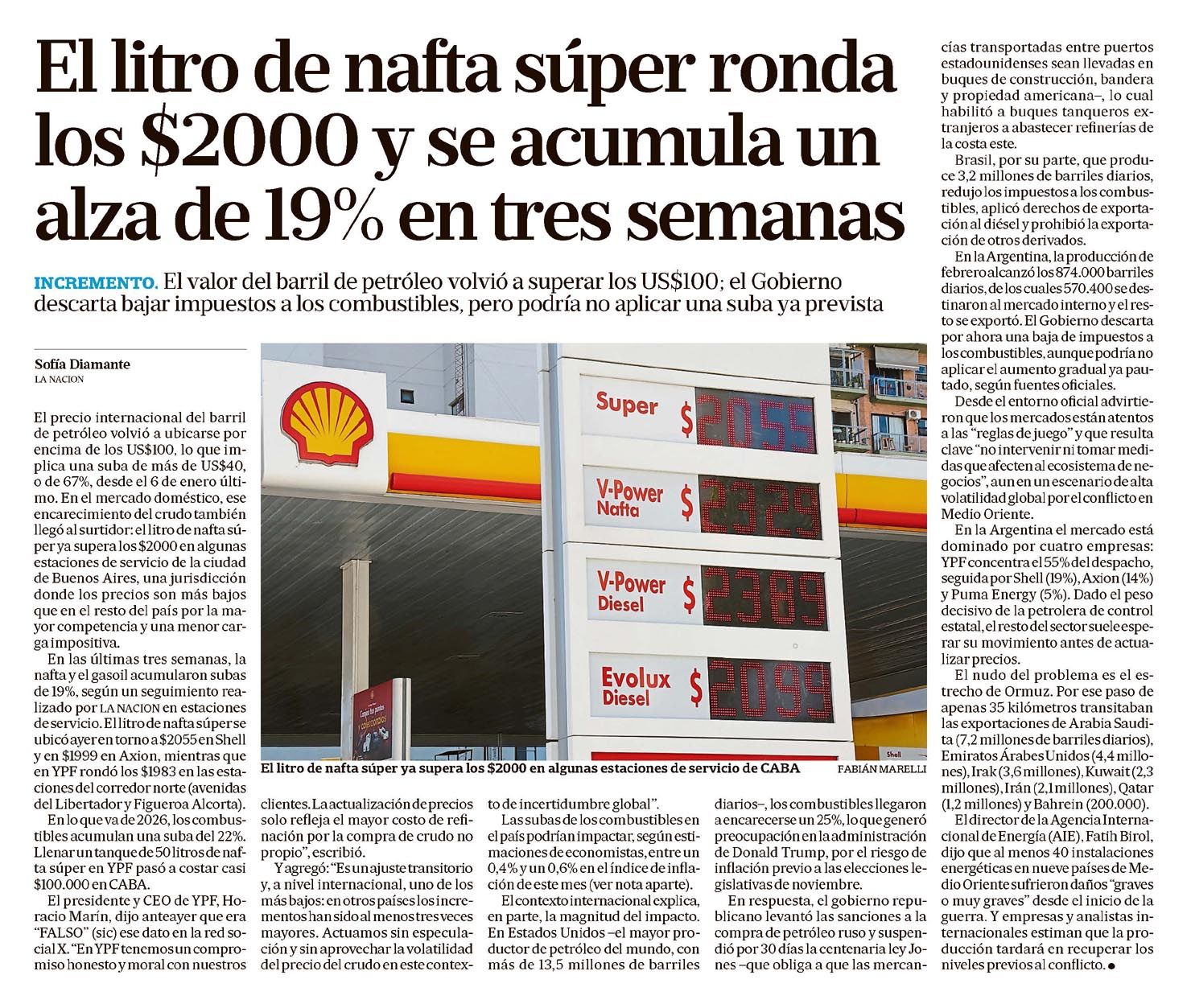 LA NACIÓN – El litro de nafta súper ronda los $2000 y se acumula una alza de 19% en tres semanas
