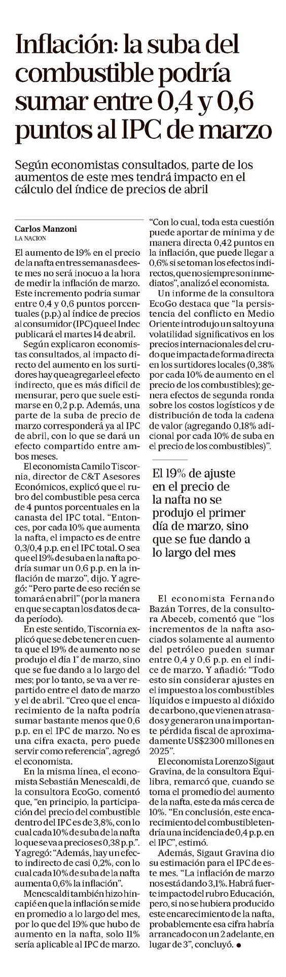 LA NACIÓN – Inflación: la suba del combustible podría sumar entre 0,4 y 0,6 puntos al IPC de marzo