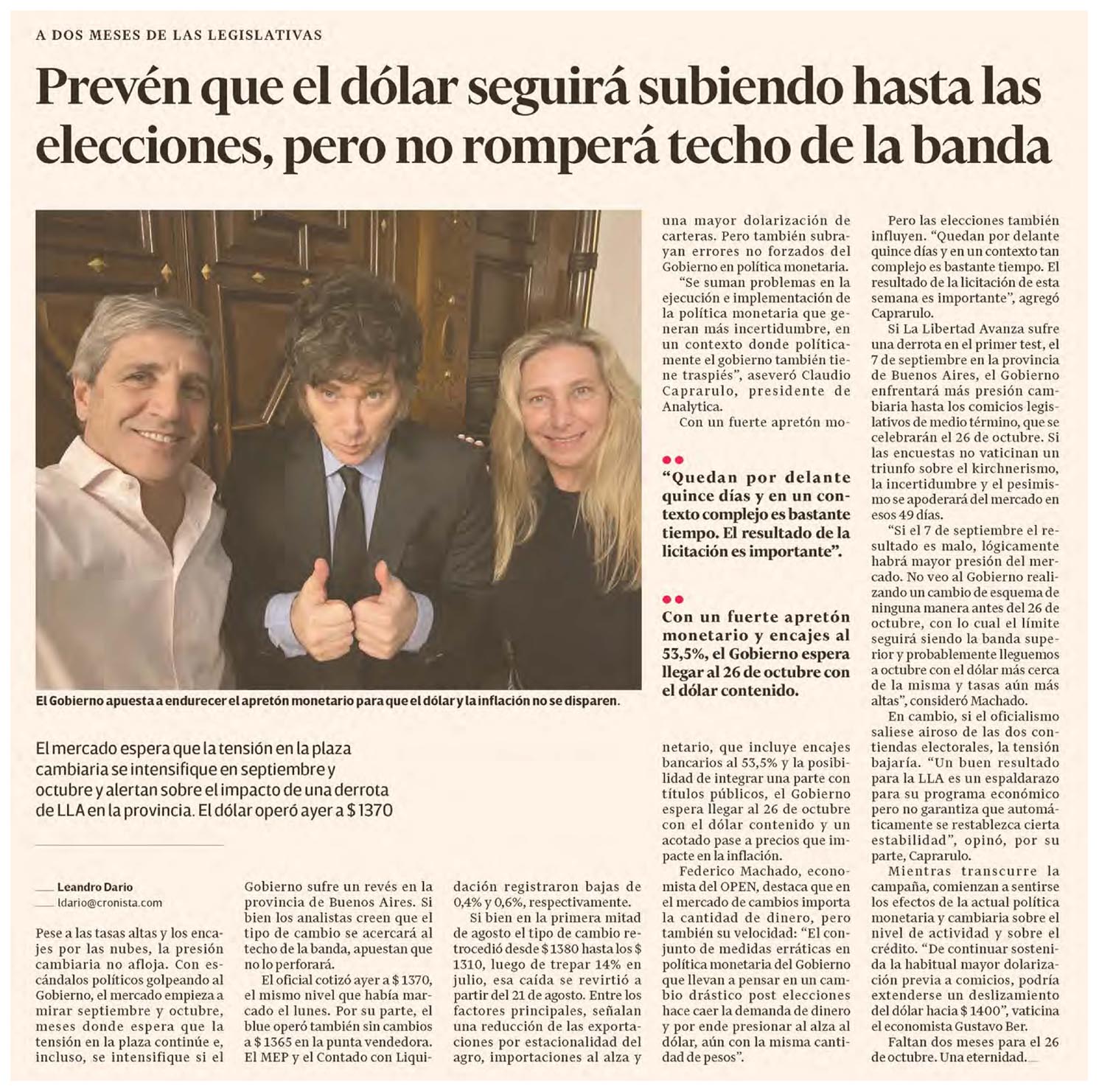 El mercado espera que la tensión en la plaza cambiarla se intensifique en septiembre y octubre y alertan sobre el impacto de una derrota de LLA en la provincia. El dólar operó ayer a $ 1370