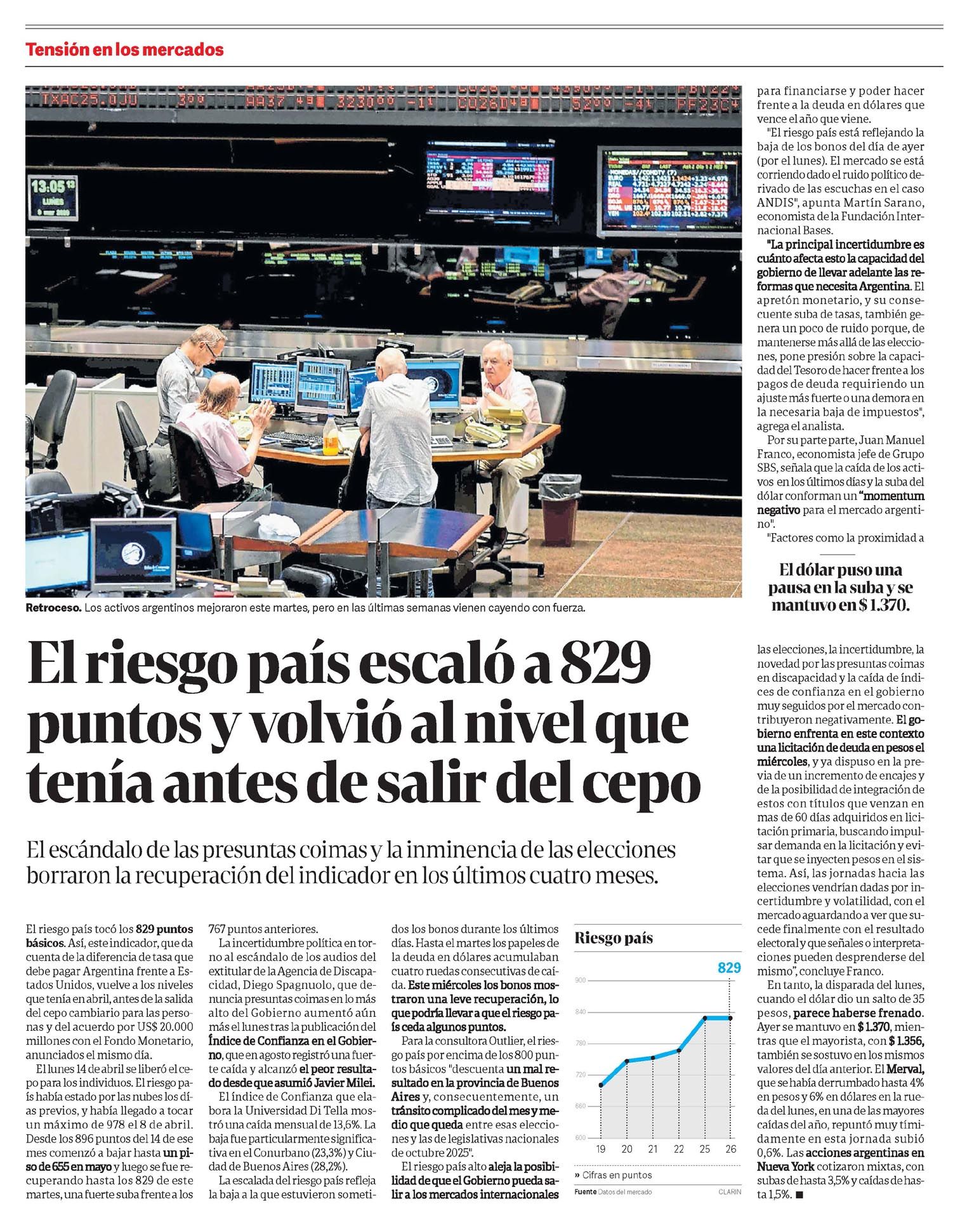 CLARÍN – El riesgo país escaló a 829 puntos y volvió al nivel que tenía antes de salir del cepo