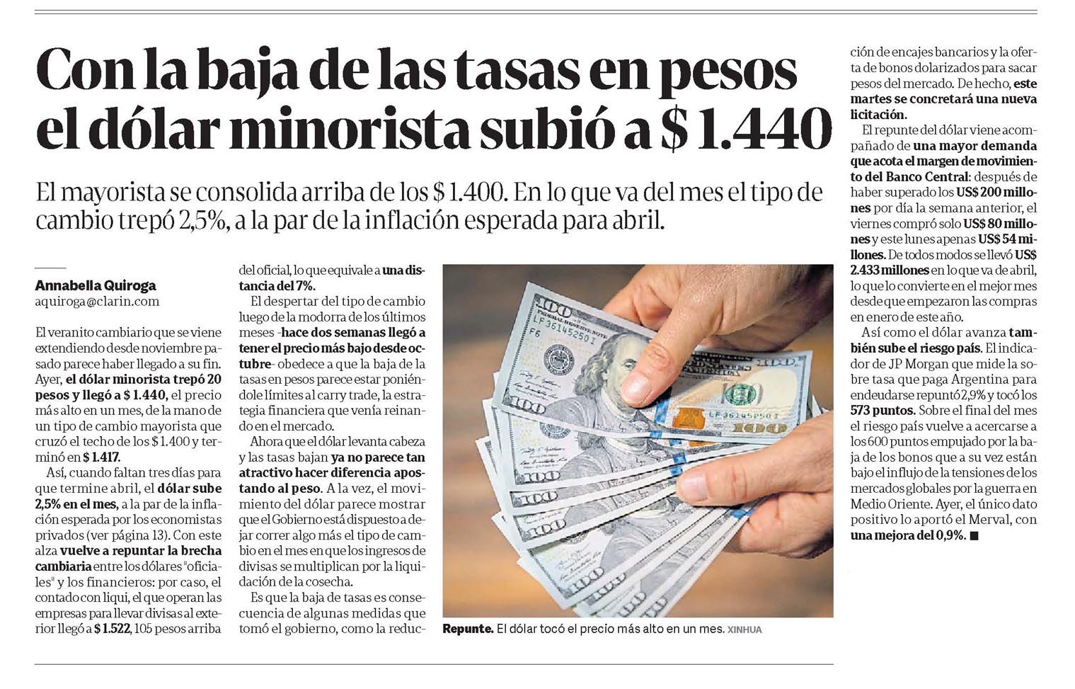 CLARÍN – Con la baja de las tasas en pesos el dólar minorista subió a $ 1.440
