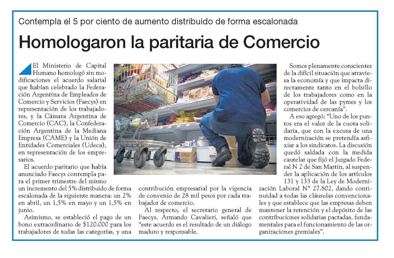 Contempla el 5 por ciento de aumento distribuido de forma escalonada. El Ministerio de Capital Humano homologó sin modificaciones el acuerdo salarial que habían celebrado la Federación Argentina de Empleados de Comercio y Servicios (Faecys) en representación de los trabajadores, y la Cámara Argentina de Comercio (CAC), la Confederación Argentina de la Mediana Empresa (CAME) y la Unión de Entidades Comerciales (Udeca), en representación de los empresarios.