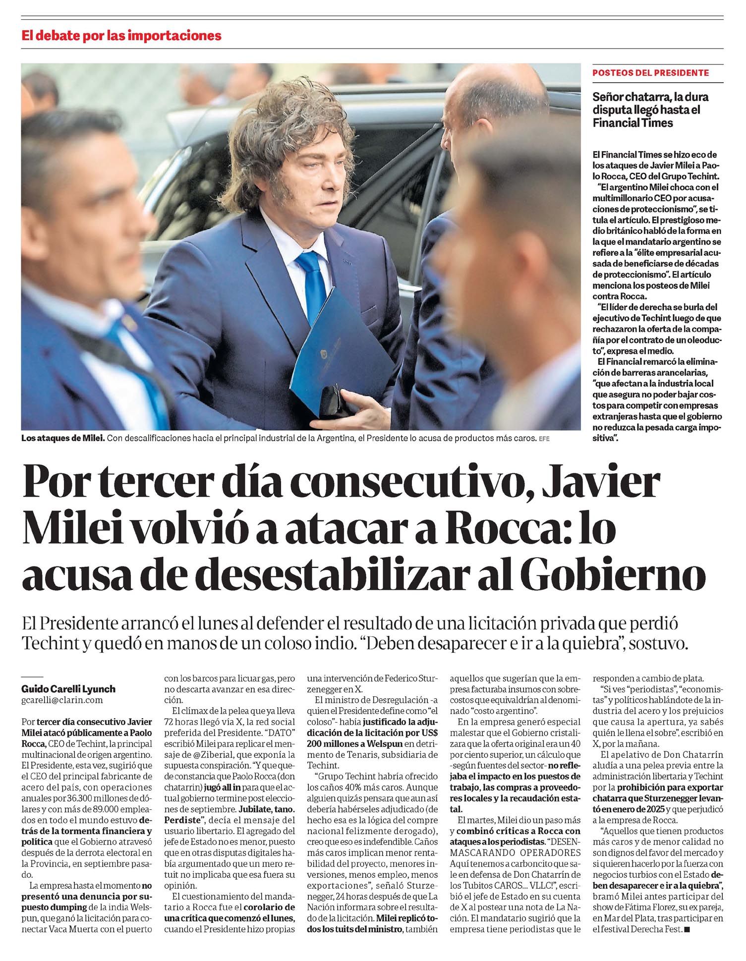 El Financial Times se hizo eco de los ataques de Javier Milei a Paolo Rocca, CEO del Grupo Techint. "El argentino Milei choca con el multimillonario CEO por acusaciones de proteccionismo", se titula el artículo. El prestigioso medio británico habló de la forma en que el mandatario argentino se refiere a la "élite empresarial acusada de beneficiarse de décadas de proteccionismo". El artículo menciona los posteos de Milei contra Rocca.