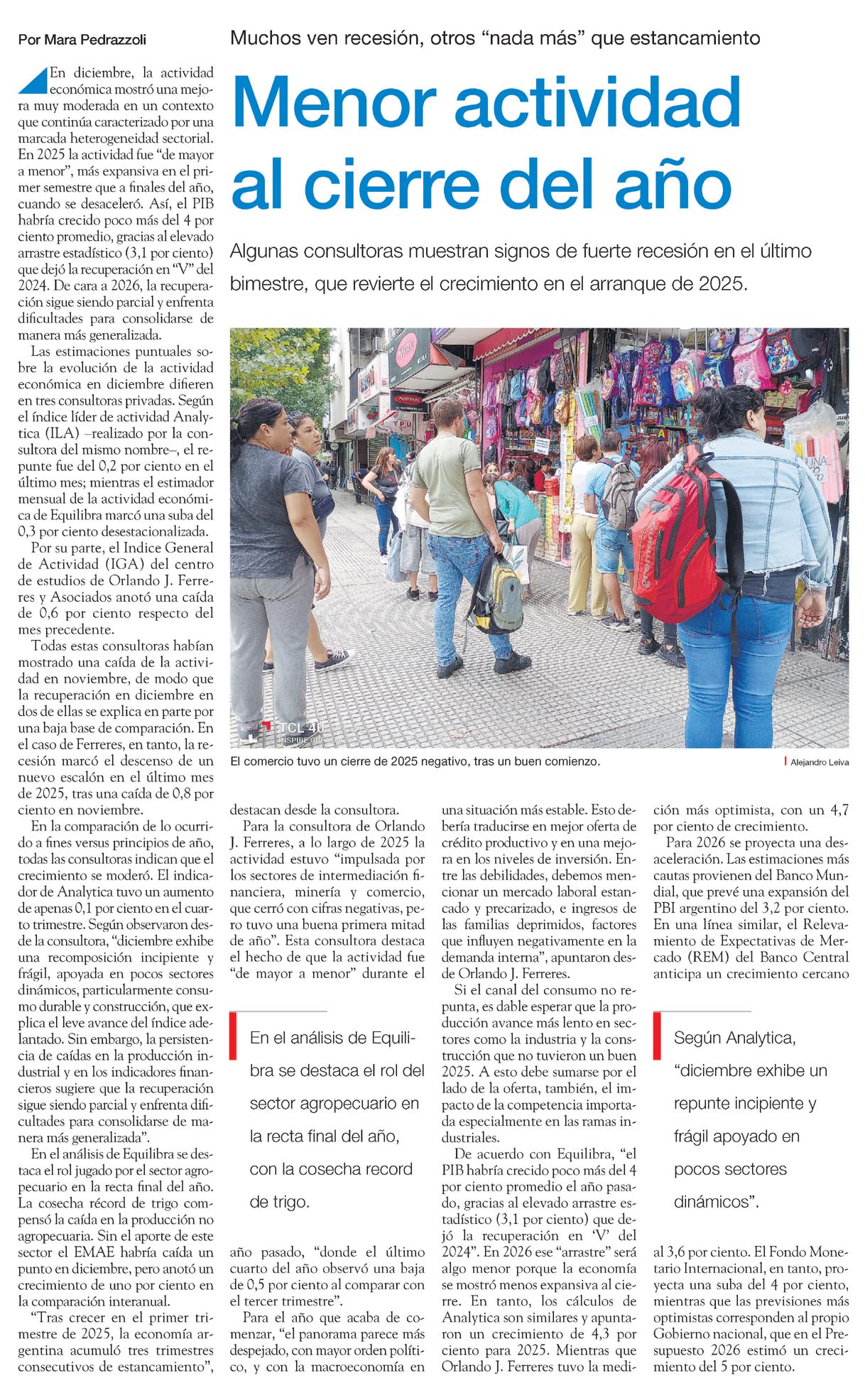 En diciembre, la actividad económica mostró una mejora muy moderada en un contexto que continúa caracterizado por una marcada heterogeneidad sectorial. En 2025 la actividad fue "de mayor a menor", más expansiva en el primer semestre que a finales del año, cuando se desaceleró. Así, el PIB habría crecido poco más del 4 por ciento promedio, gracias al elevado arrastre estadístico (3,1 por ciento) que dejó la recuperación en "V" del 2024. De cara a 2026, la recuperación sigue siendo parcial y enfrenta dificultades para consolidarse de manera más generalizada.