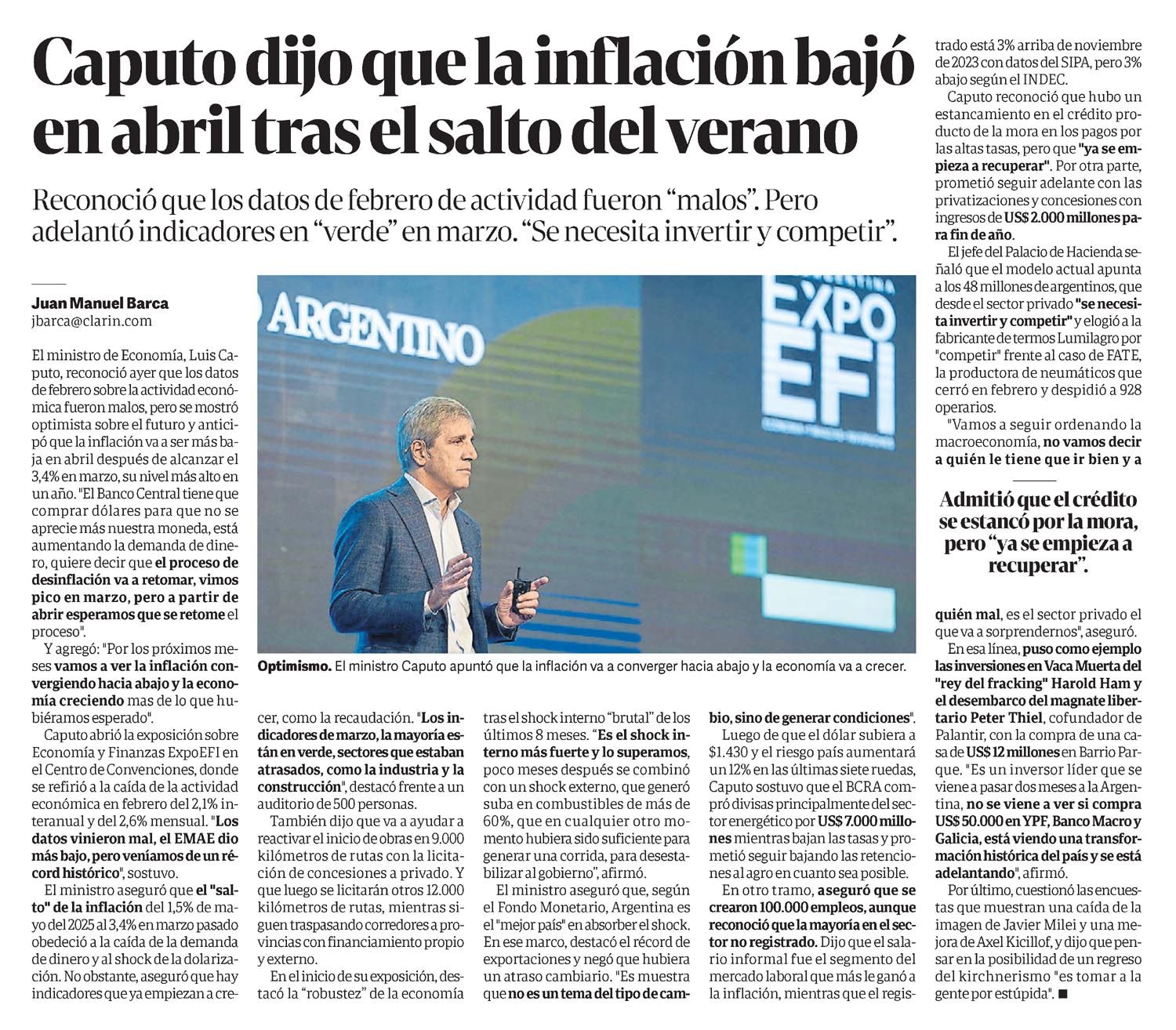 CLARÍN – Caputo dijo que la inflación bajó en abril tras el salto del verano