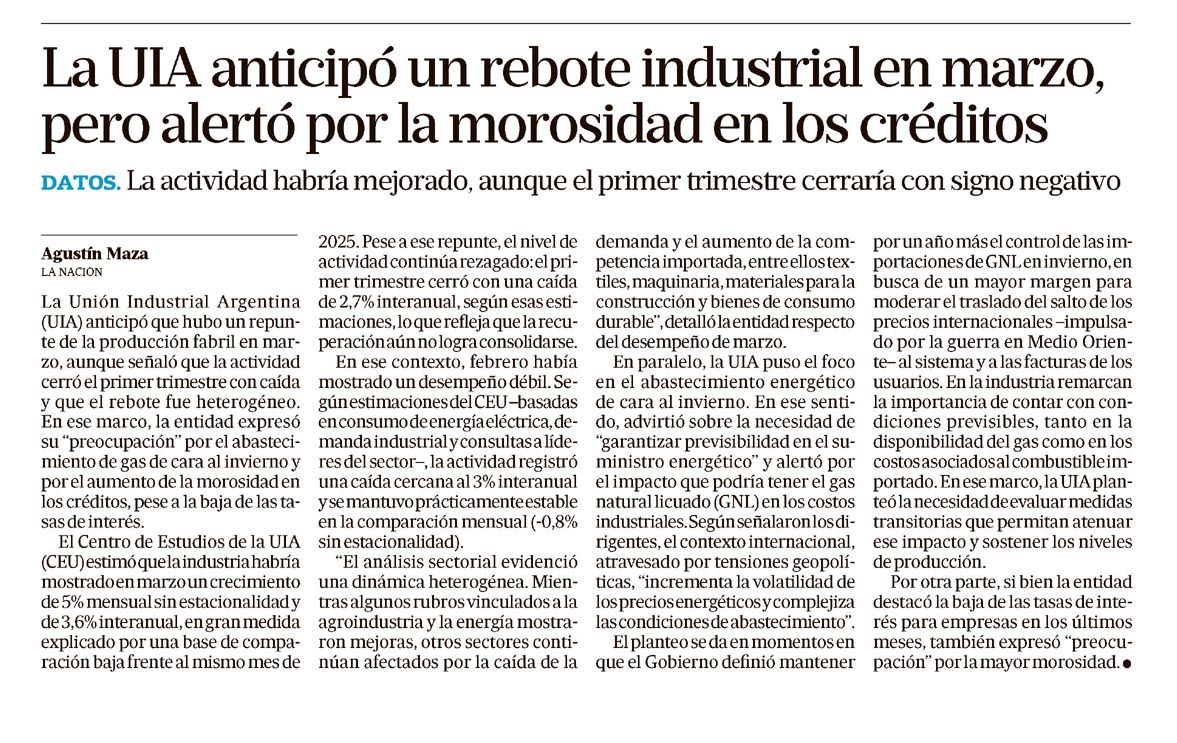 La Unión Industrial Argentina (UIA) anticipó que hubo un repunte de la producción fabril en marzo, aunque señaló que la actividad cerró el primer trimestre con caída y que el rebote fue heterogéneo. En ese marco, la entidad expresó su "preocupación" por el abastecimiento de gas de cara al invierno y por el aumento de la morosidad en los créditos, pese a la baja de las tasas de interés.