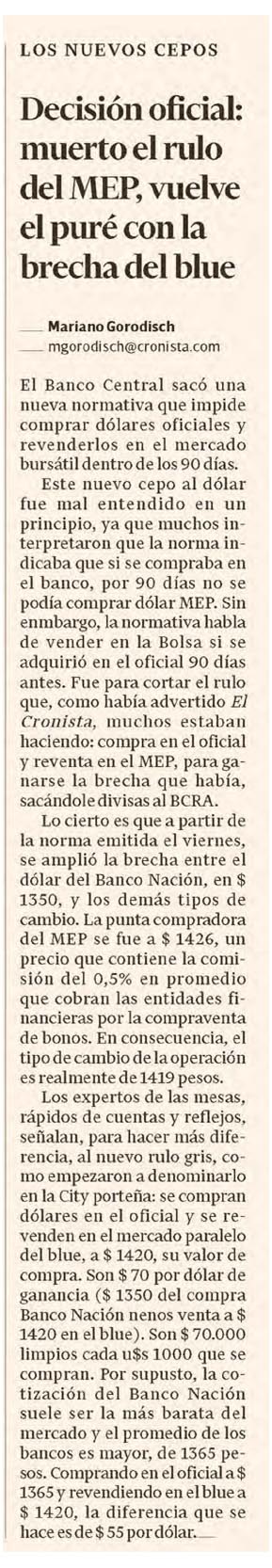 EL CRONISTA – Decisión oficial: muerto el rulo del MEP, vuelve el puré con la brecha del blue