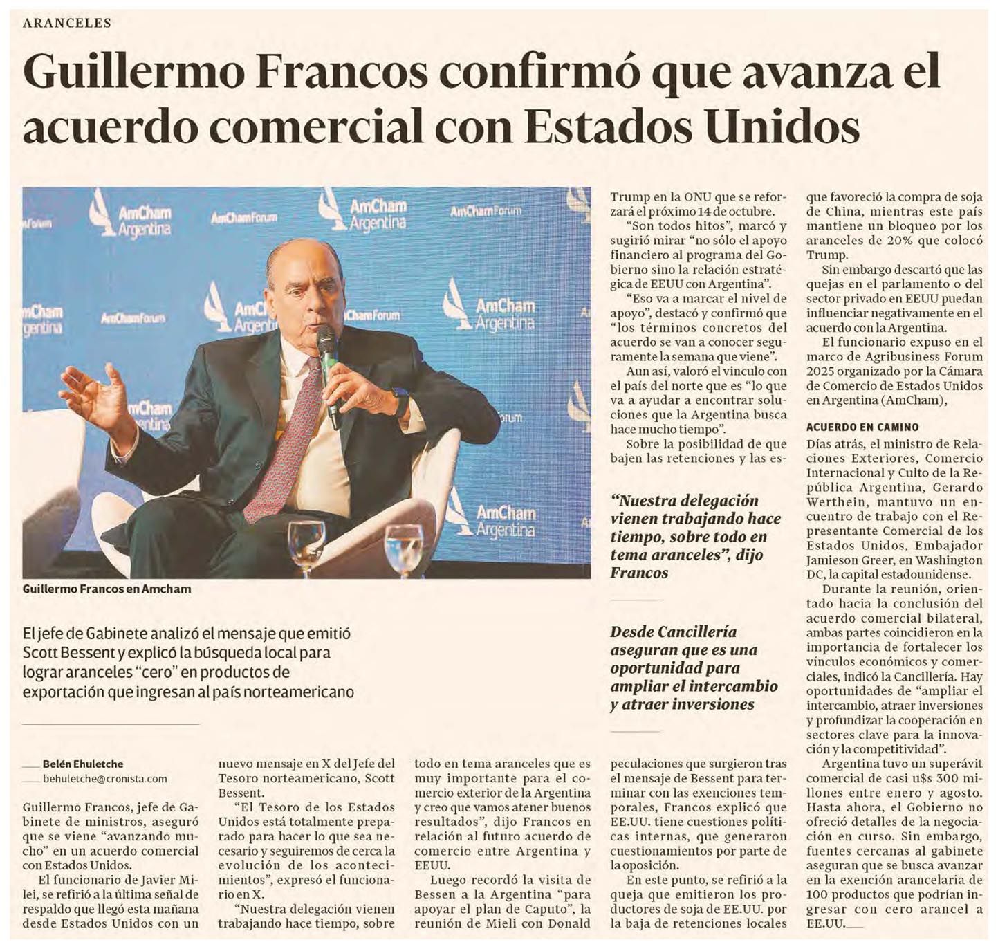EL CRONISTA – Guillermo Francos confirmó que avanza el acuerdo comercial con Estados Unidos