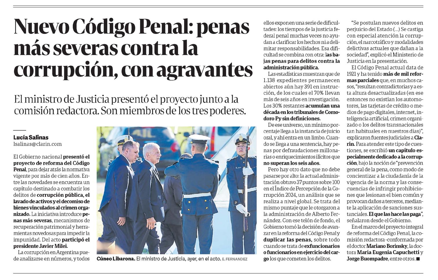 CLARÍN – Nuevo Código Penal: penas más severas contra la corrupción, con agravantes