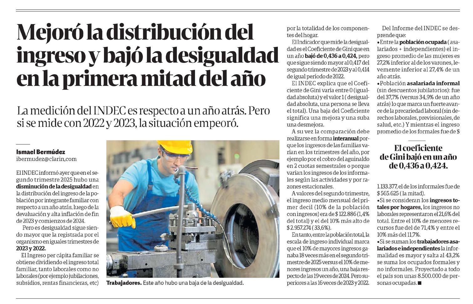 CLARÍN – Mejoró la distribución del ingreso y bajó la desigualdad en la primera mitad del año