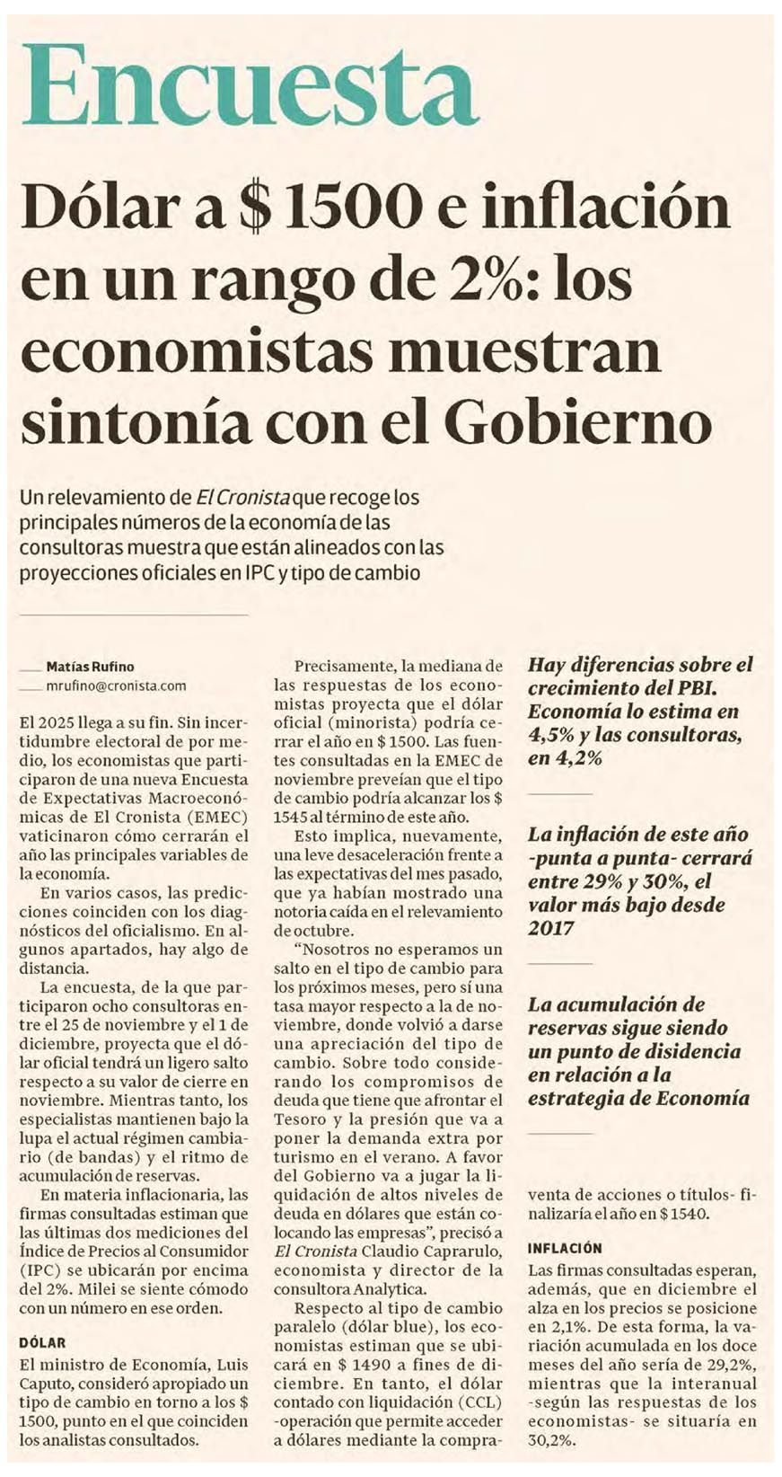 Un relevamiento de El Cronista que recoge los principales números de la economía de las consultoras muestra que están alineados con las proyecciones oficiales en IPC y tipo de cambio