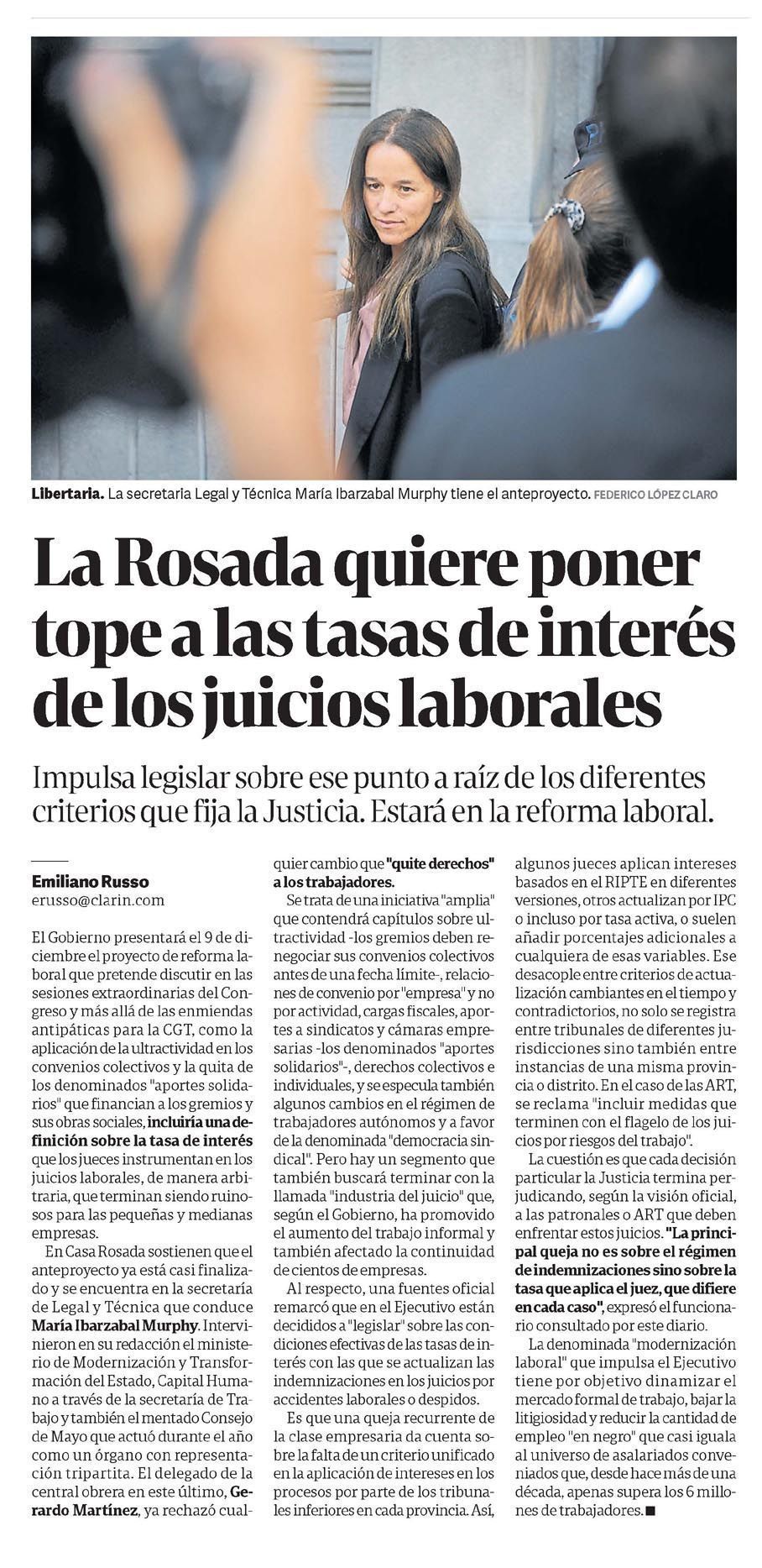 El Gobierno presentará el 9 de diciembre el proyecto de reforma laboral que pretende discutir en las sesiones extraordinarias del Congreso y más allá de las enmiendas antipáticas para la CGT, como la aplicación de la ultractividad en los convenios colectivos y la quita de los denominados "aportes solidarios" que financian a los gremios y sus obras sociales, incluiría una definición sobre la tasa de interés que los jueces instrumentan en los juicios laborales, de manera arbitraria, que terminan siendo ruinosos para las pequeñas y medianas empresas.