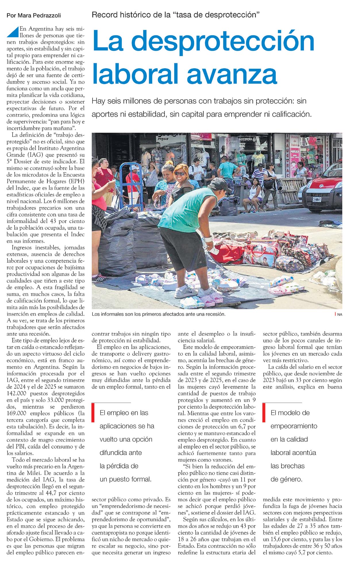 En Argentina hay seis millones de personas que tienen trabajos desprotegidos: sin aportes, sin estabilidad y sin capital propio para emprender ni calificación. Para este enorme segmento de la población, el trabajo dejó de ser una fuente de certidumbre y ascenso social. Ya no funciona como un ancla que permita planificar la vida cotidiana, proyectar decisiones o sostener expectativas de futuro. Por el contrario, predomina una lógica de supervivencia: "pan para hoy e incertidumbre para mañana".