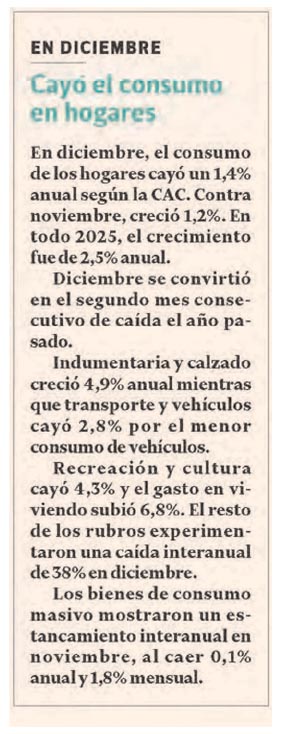 En diciembre, el consumo de los hogares cayó un 1,4% anual según la CAC. Contra noviembre, creció 1,2%. En todo 2025, el crecimiento fue de 2,5% anual.