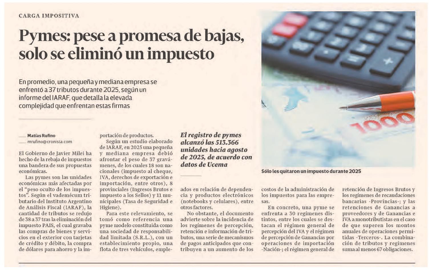 En promedio, una pequeña y mediana empresa se enfrentó a 37 tributos durante 2025, según un informe del IARAF, que detalla la elevada complejidad que enfrentan estas firmas