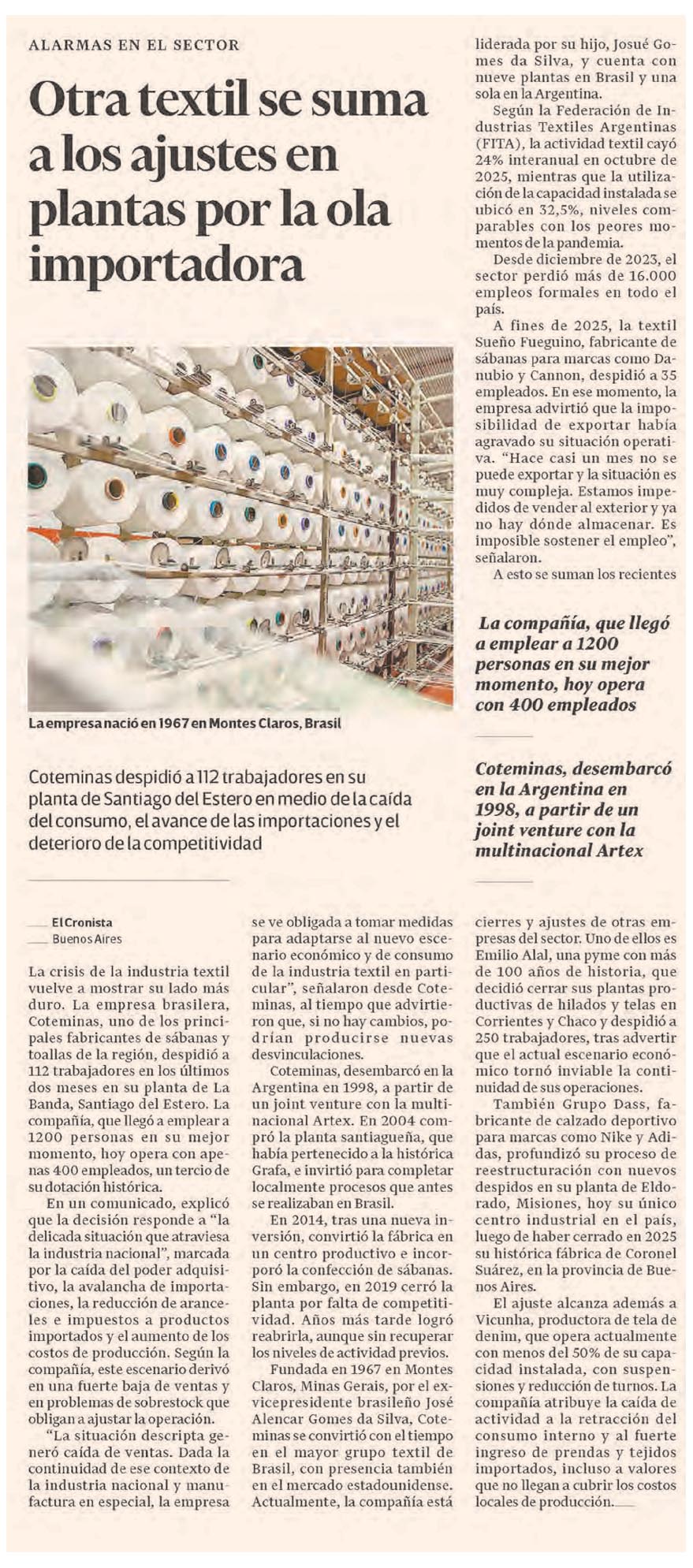 Coteminas despidió a 112 trabajadores en su planta de Santiago del Estero en medio de la caída del consumo, el avance de las importaciones y el deterioro de la competitividad
