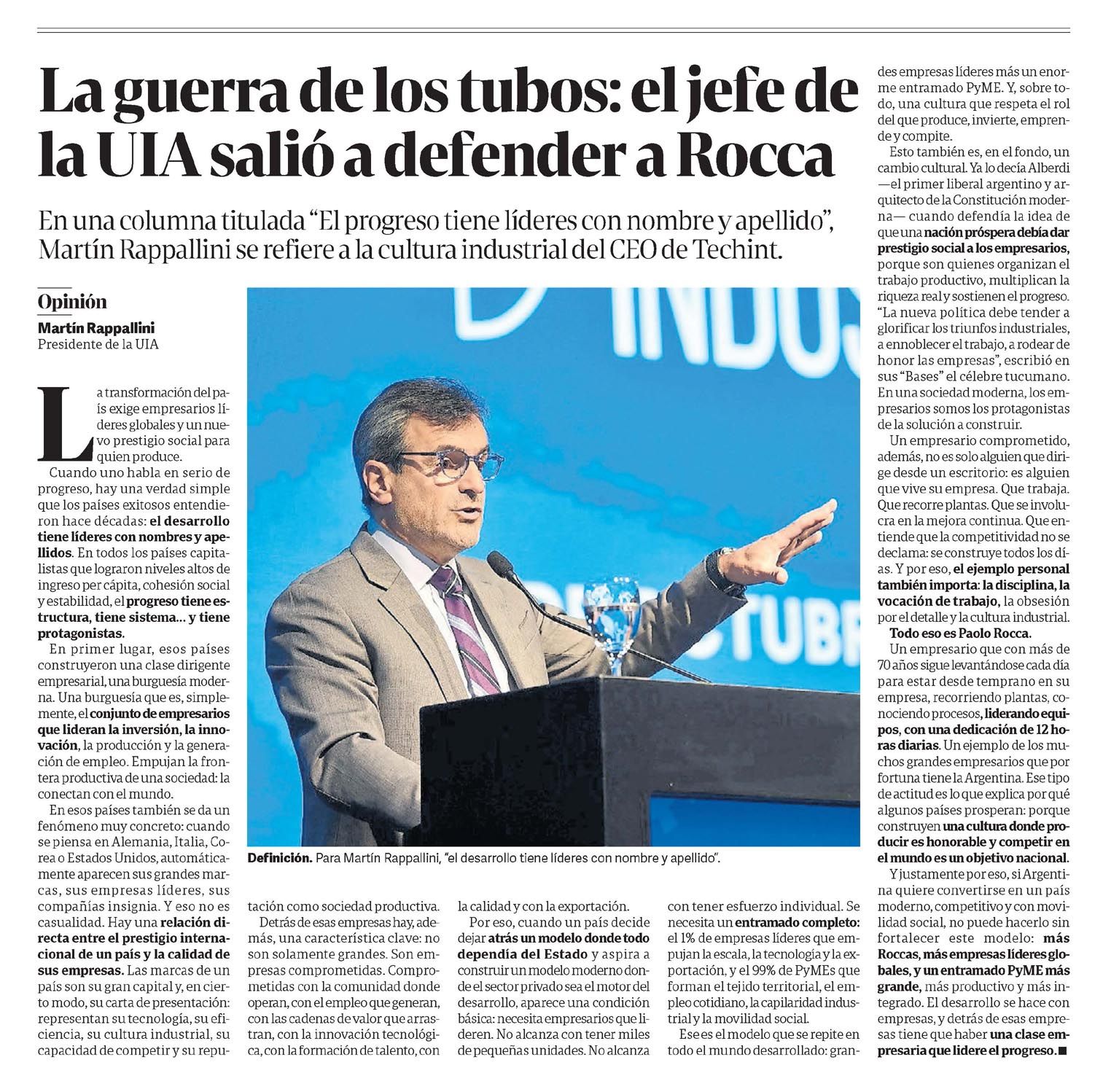 CLARÍN – La guerra de los tubos: el jefe de la UIA salió a defender a Rocca
