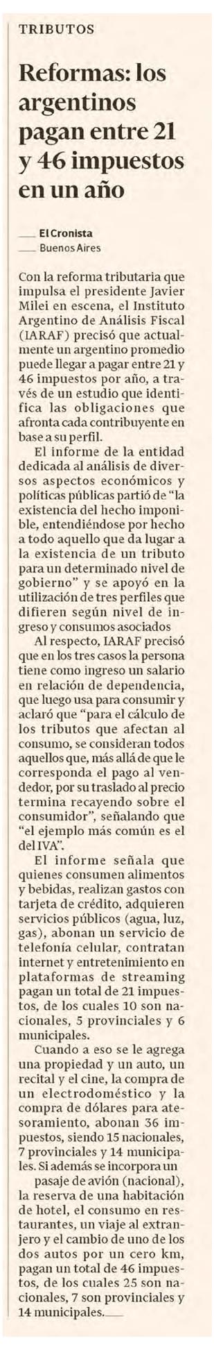 EL CRONISTA – Reformas: los argentinos pagan entre 21 y 46 impuestos en un año