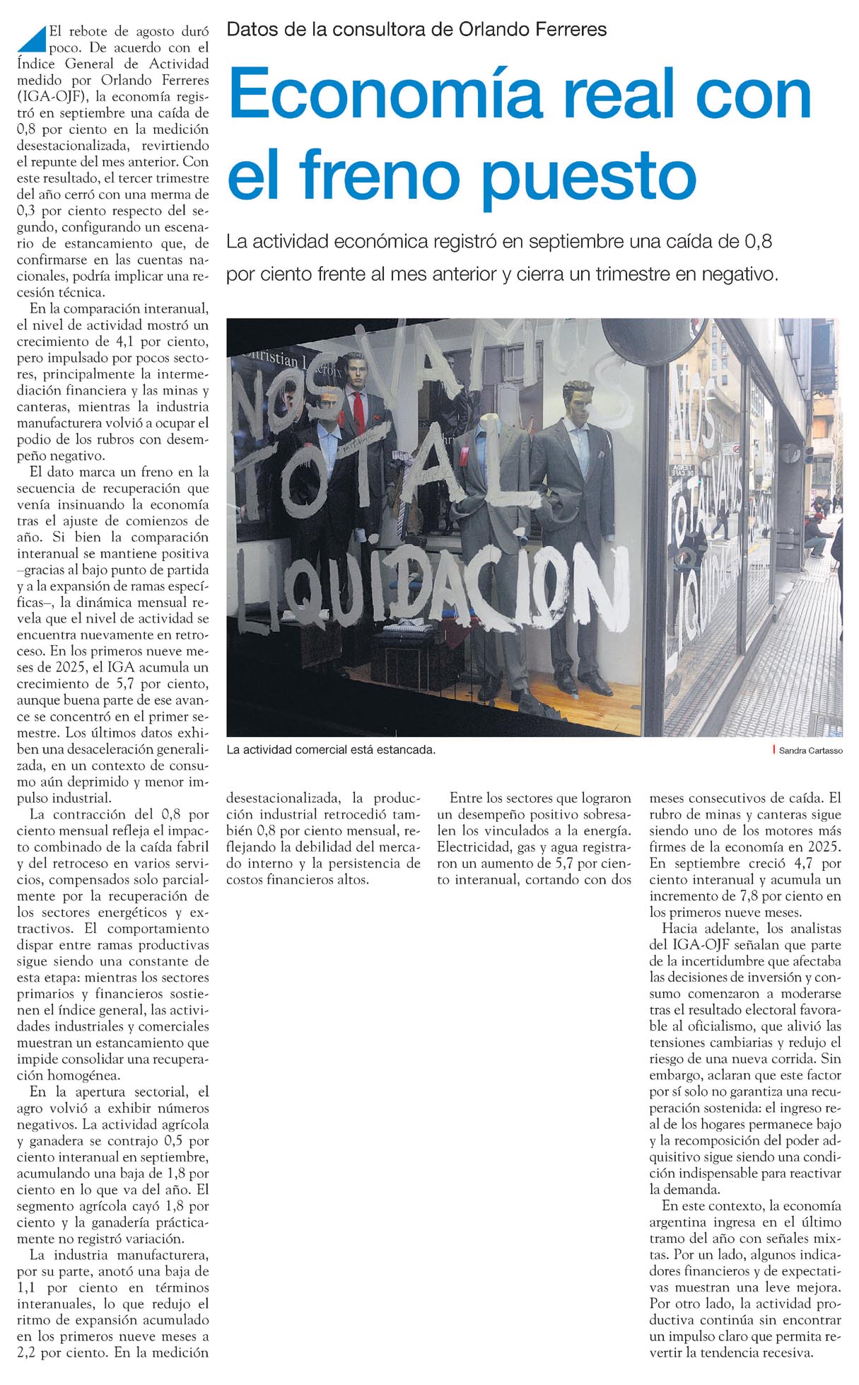 El rebote de agosto duró poco. De acuerdo con el Índice General de Actividad medido por Orlando Ferreres (IGA-OJF), la economía registró en septiembre una caída de 0,8 por ciento en la medición desestacionalizada, revirtiendo el repunte del mes anterior.