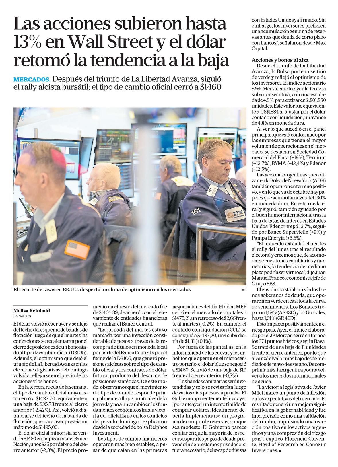 mercados. Después del triunfo de La Libertad Avanza, siguió el rally alcista bursátil; el tipo de cambio oficial cerró a $1460