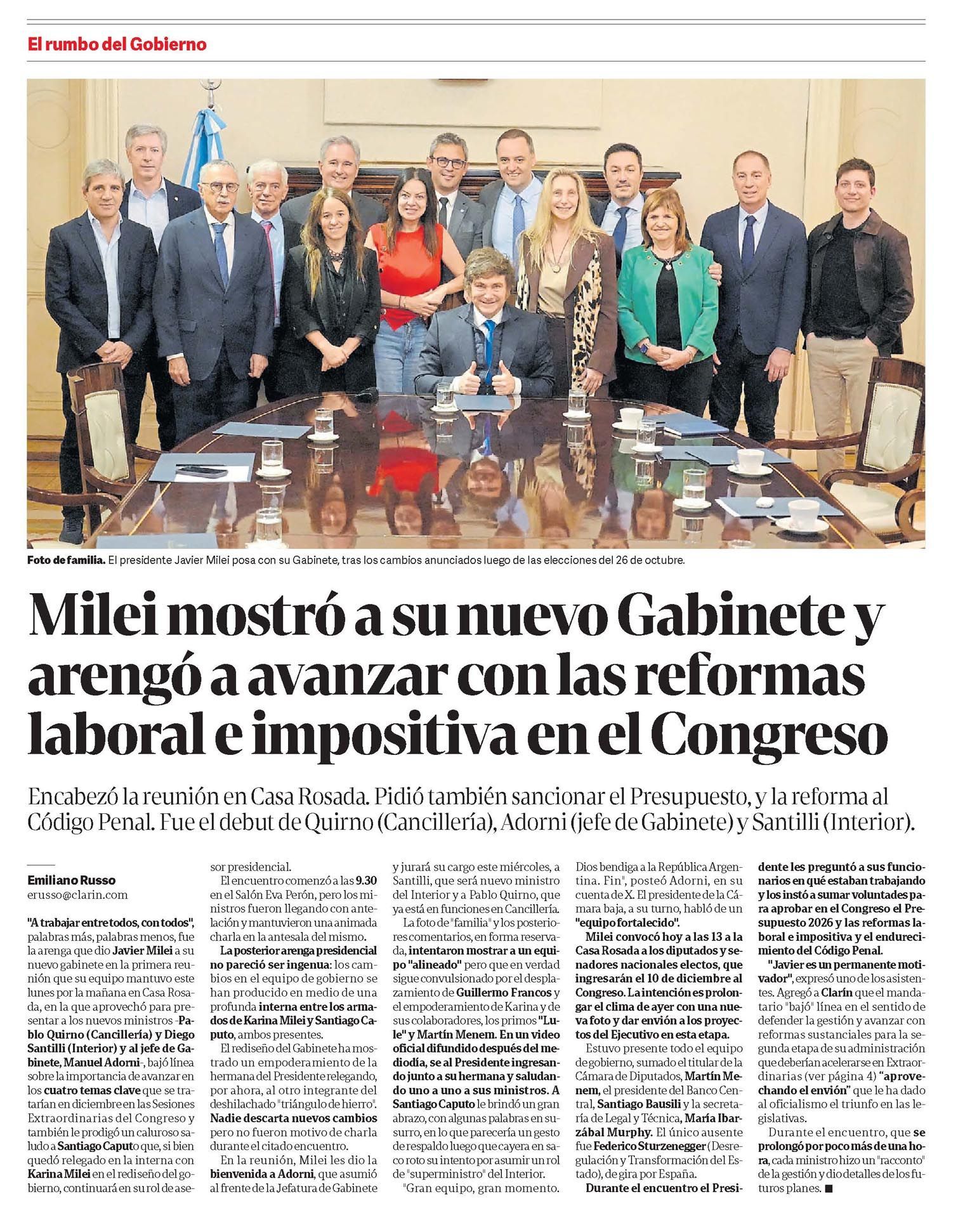 "A trabajar entre todos, con todos", palabras más, palabras menos, fue la arenga que dio Javier Milei a su nuevo gabinete en la primera reunión que su equipo mantuvo este lunes por la mañana en Casa Rosada, en la que aprovechó para presentar a los nuevos ministros -Pablo Quirno (Cancillería) y Diego Santilli (Interior)- y al jefe de Gabinete, Manuel Adorni-, bajó línea sobre la importancia de avanzar en los cuatro temas clave que se tratarían en diciembre en las Sesiones Extraordinarias del Congreso y también le prodigó un caluroso saludo a Santiago Caputo que, si bien quedó relegado en la interna con Karina Milei en el rediseño del gobierno, continuará en su rol de asesor presidencial.