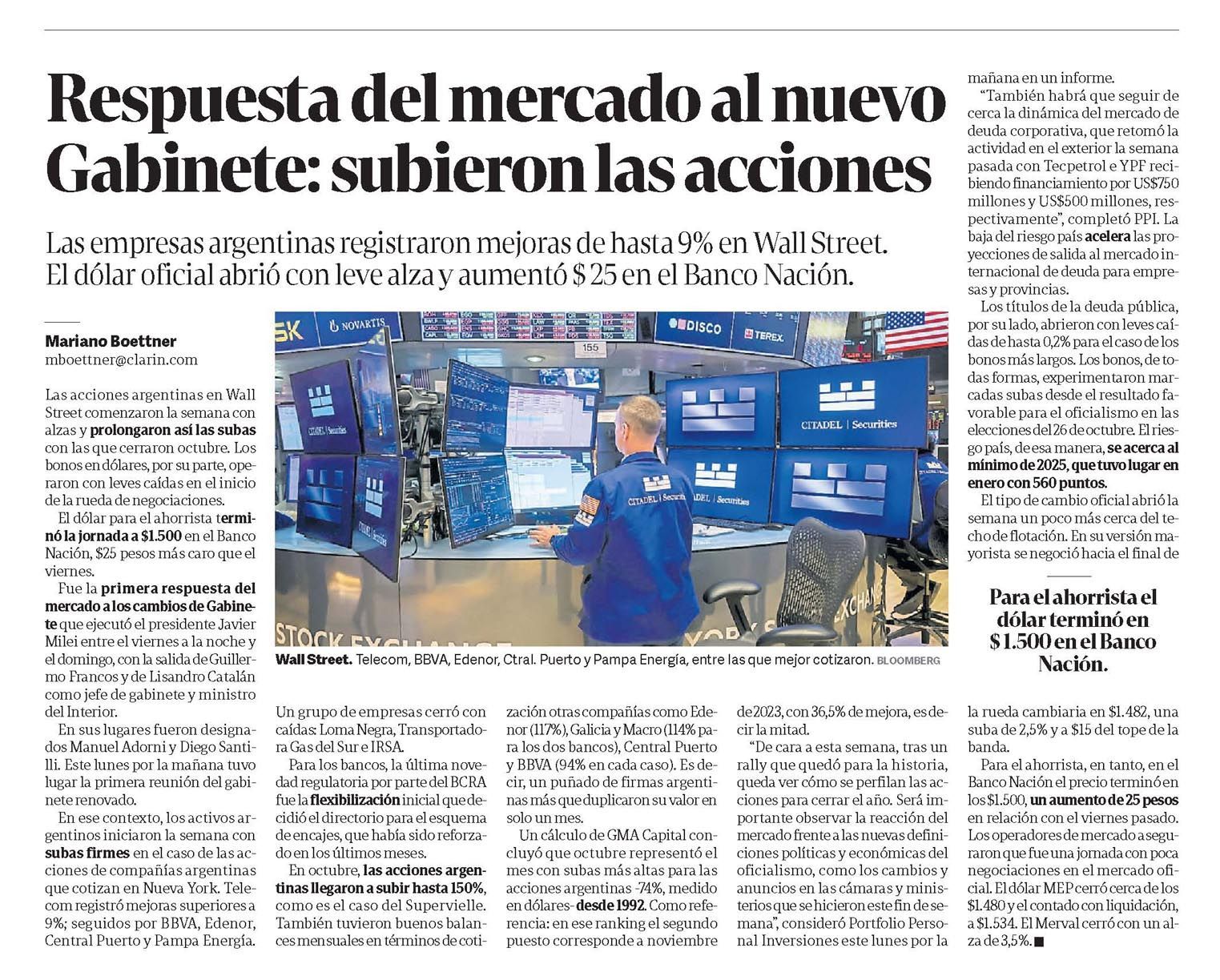 CLARÍN – Respuesta del mercado al nuevo Gabinete: subieron las acciones