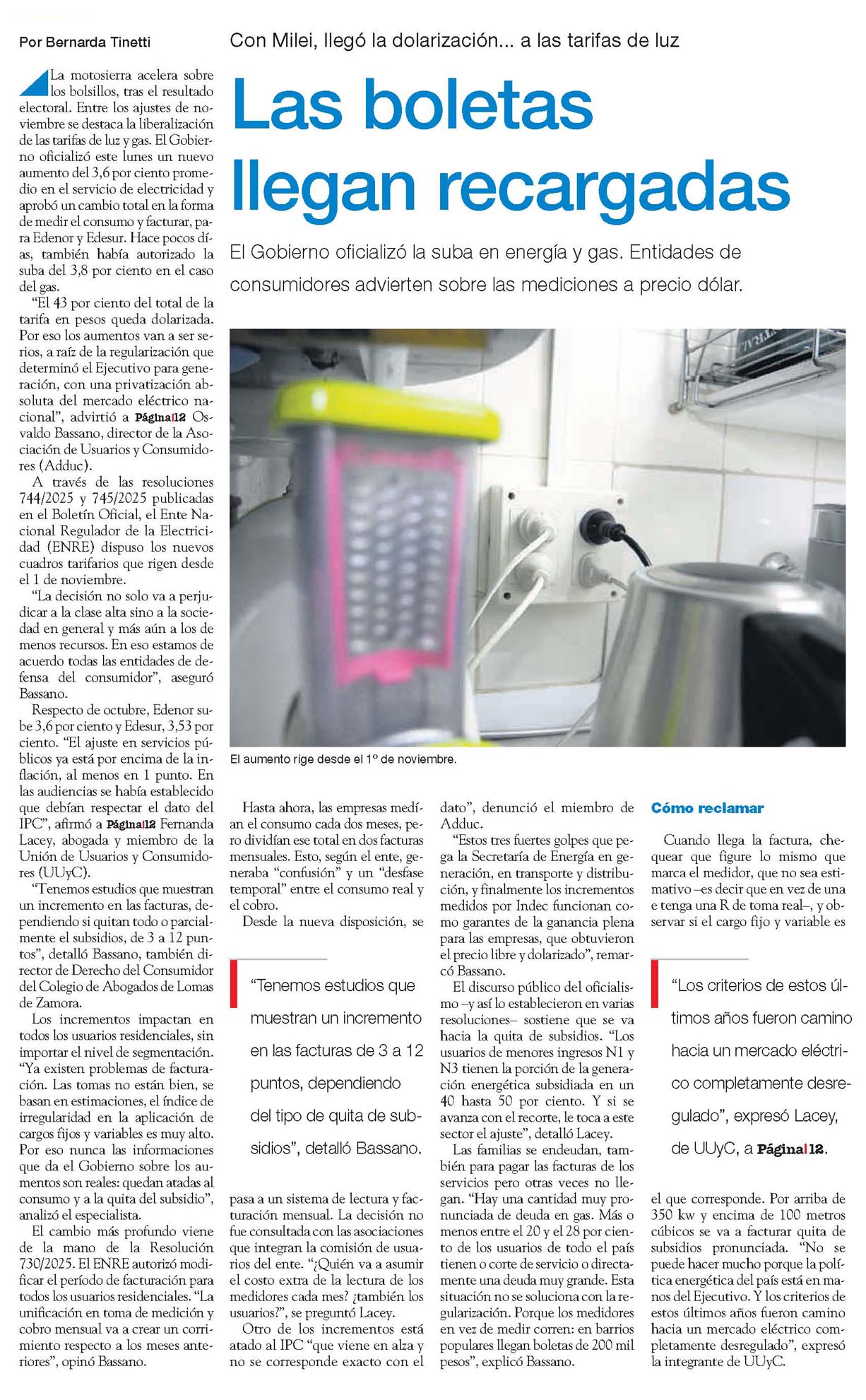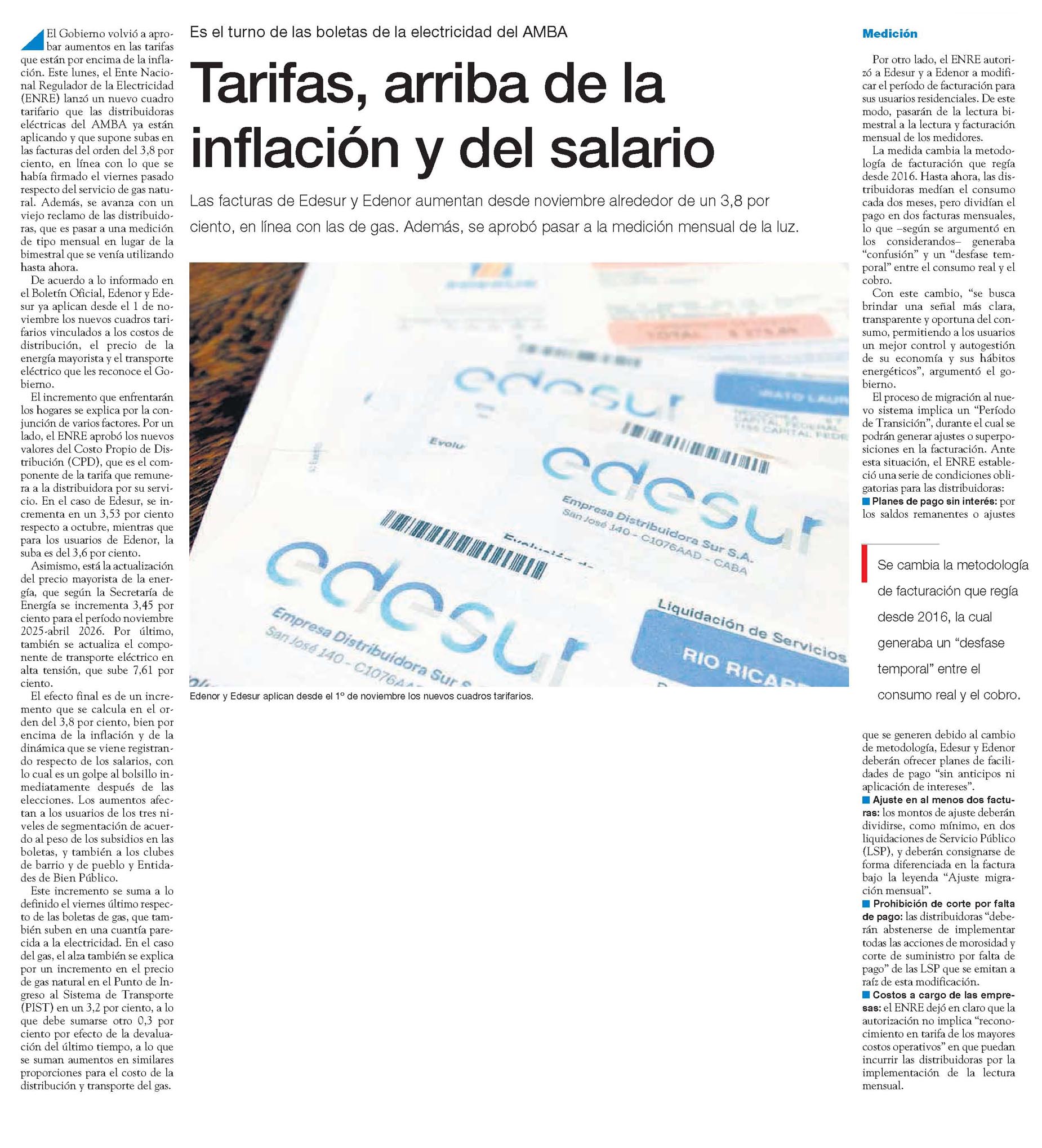 La motosierra acelera sobre los bolsillos, tras el resultado electoral. Entre los ajustes de noviembre se destaca la liberalización de las tarifas de luz y gas. El Gobierno oficializó este lunes un nuevo aumento del 3,6 por ciento promedio en el servicio de electricidad y aprobó un cambio total en la forma de medir el consumo y facturar, para Edenor y Edesur. Hace pocos días, también había autorizado la suba del 3,8 por ciento en el caso del gas.
