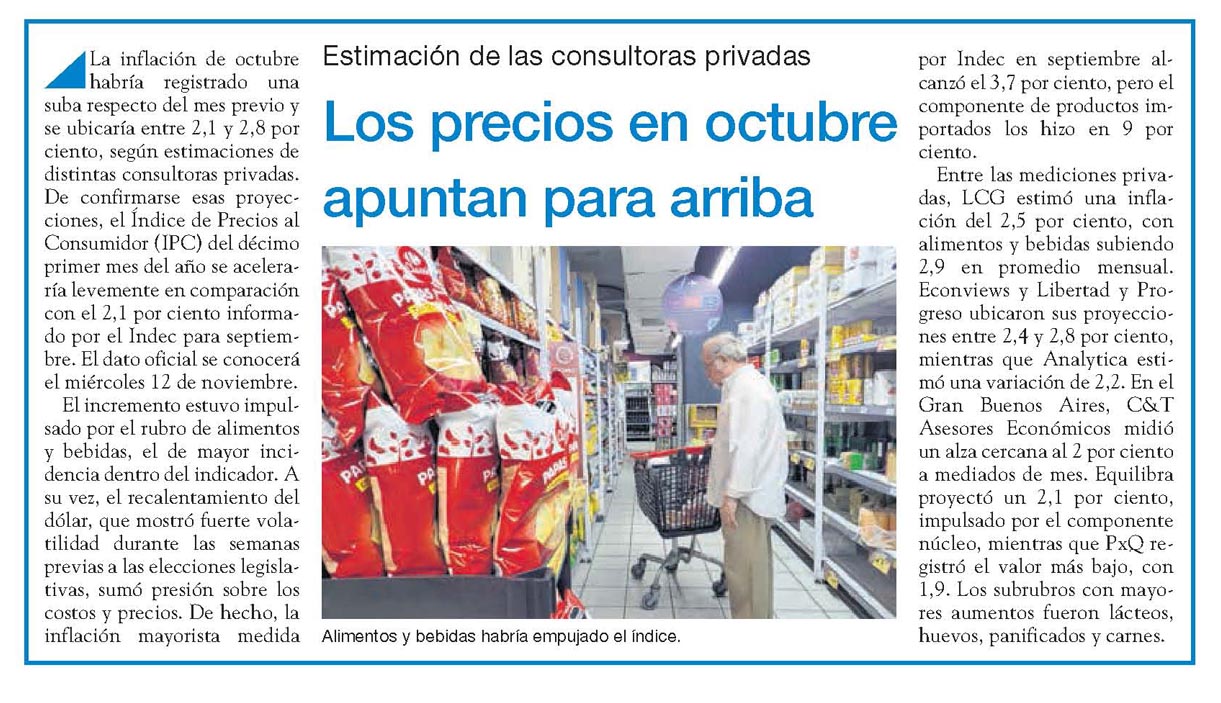 La inflación de octubre habría registrado una suba respecto del mes previo y se ubicaría entre 2,1 y 2,8 por ciento, según estimaciones de distintas consultoras privadas. De confirmarse esas proyecciones, el Índice de Precios al Consumidor (IPC) del décimo primer mes del año se aceleraría levemente en comparación con el 2,1 por ciento informado por el Indec para septiembre.